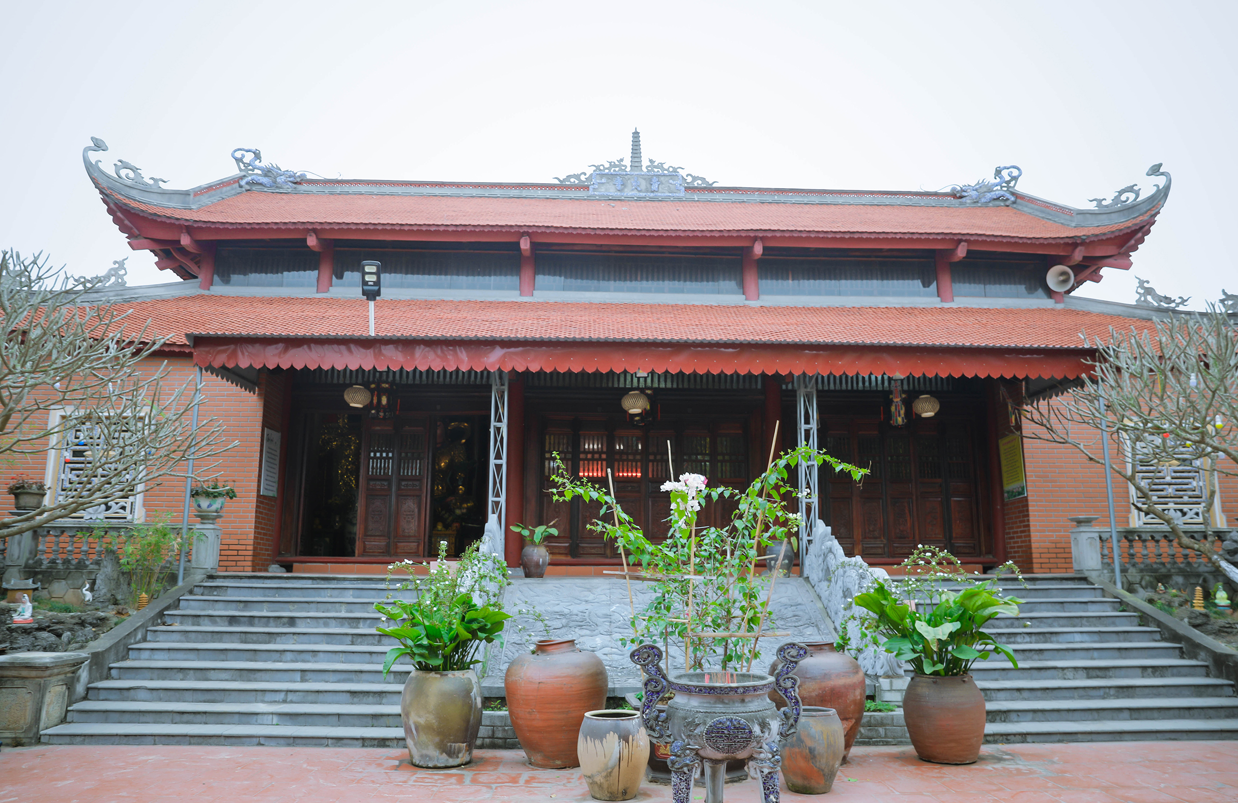Tòa Tam bảo có diện tích 500m2. Tiền đường 5 gian với 3 gian hậu cung và 2 dĩ dài 21m. Tường xây bằng gạch đỏ với mái cong đầu Rồng và các linh vật họa tiết hoa văn thời Lý Trần. Lối đi lên cửa chính điện là đôi Rồng đá uốn lượn mềm mại mà uy nghiêm. Các hạng mục bên trong chùa và cánh cửa đều bằng gỗ lim với gam màu trầm uy linh thanh tịnh.