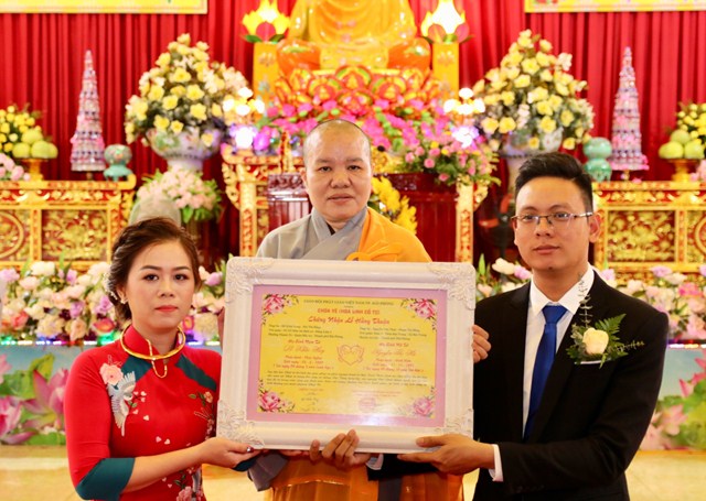 Ni sư Thích Tâm Chính trao giấy chứng nhận hằng thuận cho đôi bạn trẻ