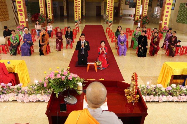 Dưới sự gia hộ của mười phương Chư Phật và sự chứng minh của Chư tôn đức hiện tiền, đôi bạn trẻ đã làm lễ tạ ơn Tam Bảo, lễ tri ân công sinh thành dưỡng dục của cha mẹ thông qua nghi thức dâng trà mời cha mẹ. Cha mẹ của đôi tân lang và tân nương đã không khỏi xúc động khi có lẽ đây là lần đầu tiên con cái lễ tạ ơn, cũng như dâng chén trà tận tay để bày tỏ lòng biết ơn hai đấng sinh thành đã cho các con có được hình hài, sự trưởng thành như ngày hôm nay.
