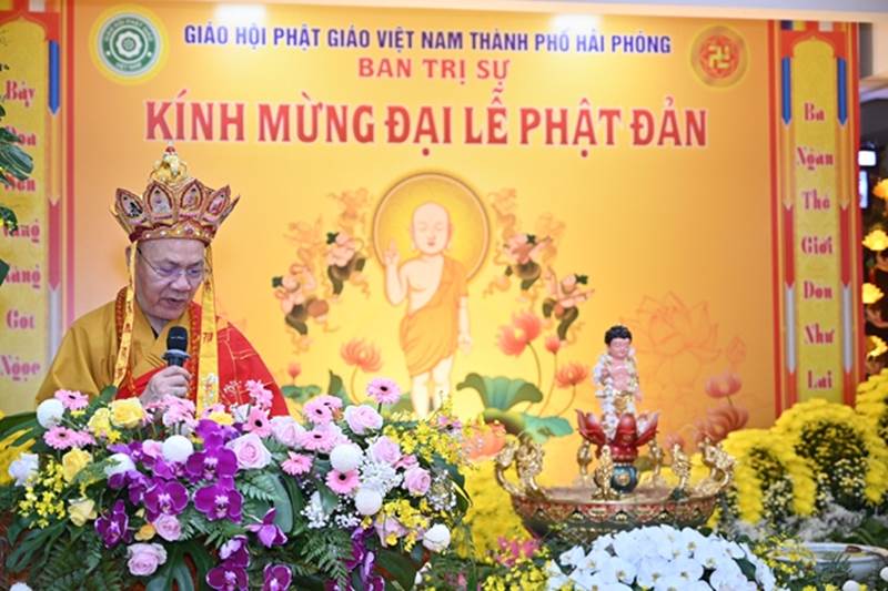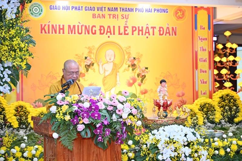HT. Thích Quảng Tùng cung tuyên Thông điệp Phật đản PL. 2567 – DL. 2023Tiếp đó, Hòa thượng Thích Thanh Giác – Phó trưởng Ban Thường trực Ban Trị sự GHPGVN thành phố Hải Phòng đã lên tuyên đọc Diễn văn kính mừng Phật đản PL.2567 – DL.2023 của Hòa thượng Thích Thiện Nhơn – Chủ tịch HĐTS GHPGVN. Trong bài diễn văn, Hòa thượng Chủ tịch mong muốn toàn thể Tăng Ni, Cư sĩ, Phật tử Việt Nam ở trong nước, cũng như ở nước ngoài hãy tinh tấn tu học, nỗ lực trong tu tập Giới – Định – Tuệ, nêu cao pháp hành trì giới luật thực hiện phương châm: Kỷ cương – Trách nhiệm – Đoàn kết – Phát triển để trang nghiêm Giáo hội. Đặc biệt, năm nay các cấp Giáo hội phải thành tựu nhiều Phật sự để bày tỏ lòng tri ân và nguyện noi theo công hạnh, sự nghiệp lớn lao của các bậc Thiền sư, Quốc sư Phật giáo Việt Nam trong lịch sử. Đó là kỷ niệm 1005 năm ngày Quốc sư Vạn Hạnh viên tịch, 715 năm Đức vua – Phật hoàng Trần Nhân Tông nhập niết bàn và Đại lễ kỷ niệm 60 năm ngày Bồ tát Thích Quảng Đức vị pháp thiêu thân trong công cuộc đấu tranh giành độc lập dân tộc thống nhất đất nước.