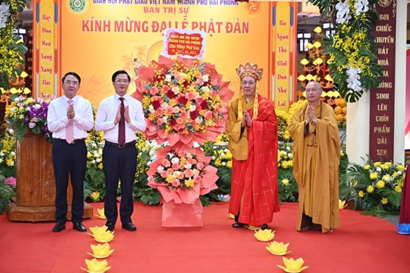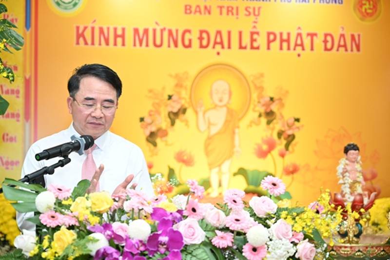 Ông Lê Khắc Nam – Phó Chủ tịch UBND thành phố phát biểu chúc mừng tại buổi lễÔng tin rằng với truyền thống Lục hòa – Từ bi – Trí tuệ của đạo Phật, GHPGVN thành phố sẽ tiếp tục thực hiện tốt phương châm Kỷ Cương – Đoàn Kết – Trách nhiệm để đưa Phật giáo thành phố trong thời kỳ đổi mới luôn ổn định và phát triển; phối hợp vận động Tăng, Ni, Phật tử và nhân dân thực hiện tốt mọi chủ trương, đường lối của Đảng, chính sách, pháp luật của Nhà nước và các quy định của Giáo hội; chủ động tham gia các phong trào thi đua yêu nước, các cuộc vận động do UBMTTQVN thành phố phát động nhằm góp phần chung tay xây dựng thành phố Hải Phòng ngày càng phát triển bền vững. Nhân ngày đản sinh của Đức Phật Thích Ca mâu ni, ông kính chúc chư Hòa thượng, Thượng tọa, Ni trưởng, Ni sư, Đại đức, Tăng Ni, Cư sĩ Phật tử một mùa Phật đản thường an lạc, vô lượng cát tường và thành tựu mọi công tác Phật sự.