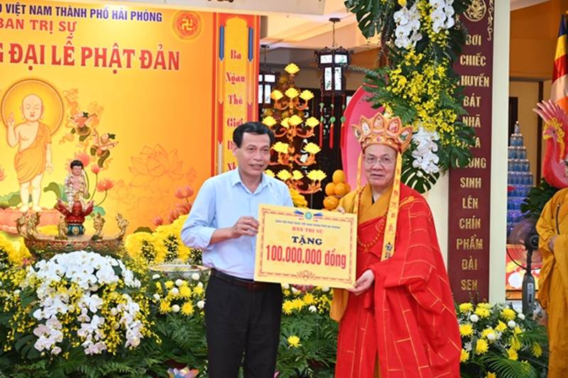 Trên tinh thần Từ bi – Cứu khổ – Ban vui của nhà Phật, với phương châm xuyên suốt của GHPGVN “Phật giáo luôn đồng hành cùng dân tộc” nhân sự kiện Phật sự trọng đại này, Ban Trị sự GHPGVN thành phố Hải Phòng đã trao 100 triệu đồng cho UB MTTQVN thành phố để trao tặng cho các gia đình thuộc diện chính sách, các gia đình có hoàn cảnh khó khăn đang sinh sống trên địa bàn thành phố, góp phần cùng chính quyền địa phương trong công cuộc xóa đói giảm nghèo, đảm bảo an sinh xã hội, không để ai bỏ lại phía sau. Đây cũng chính là hoạt động thiết thực và ý nghĩa để cúng dàng lên đức từ phụ Bản Sư Thích Ca Mâu Ni Phật nhân kỷ niệm 2647 năm ngày đản sinh.