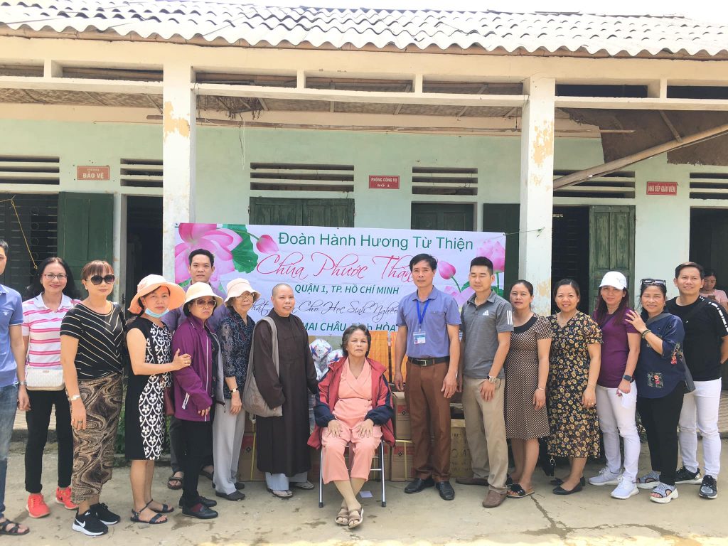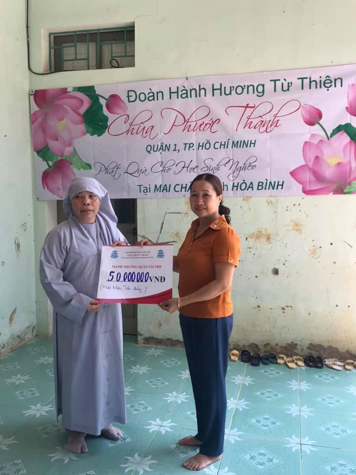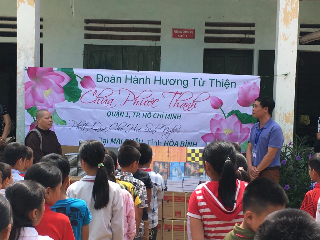 Ngoài ra đoàn từ thiện đã đến trường phổ thông dân tộc bán trú tiểu học và THCS Noong Luông, xã Thành Sơn, huyện Mai Châu, tỉnh Hòa Bình để trao 300 phần quà cho học sinh và nhà trường. Số quà trao tặng gồm dụng cụ học tập, dụng cụ thể thao... Tổng giá trị các phần quà gần 30 triệu đồng.