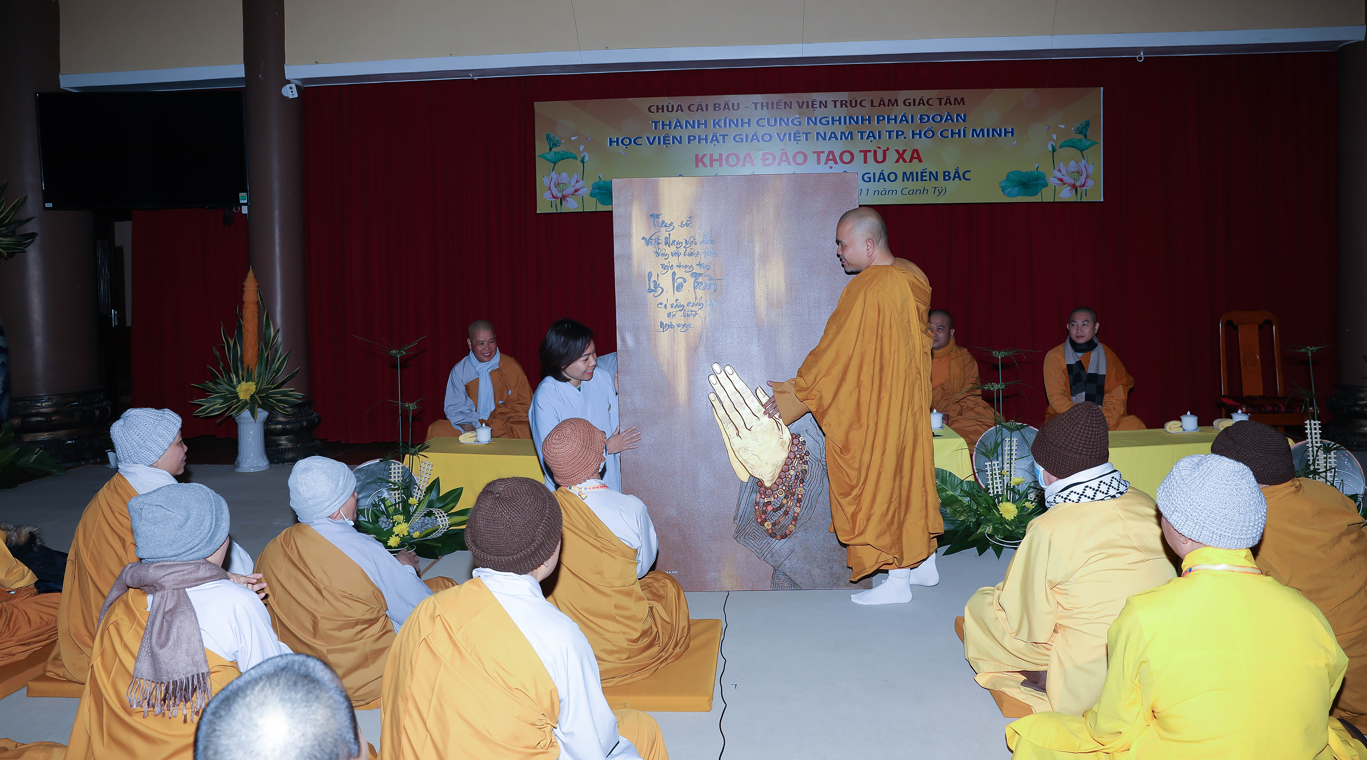 Đến thăm Thiền viện Giác Tâm Cái Bầu. Ngôi Thiền viện được tọa lạc tại xã Hạ Long, huyện Vân Đồn trên vịnh Bái Tử long. Đây là ngôi Thiền viện do Ni giới quản lý trong hệ thống các Thiền viện trong cả nước. Viện chủ thiền viện nơi đây là Ni trưởng Thích Hạnh Nhã. Đoàn chư Tôn đức lãnh đạo Học viện và các học viên đã đảnh lễ Đức Phật và tới thăm hỏi vấn an sức khỏe Ni trưởng Viện chủ, trong không khí thắm tình đạo vị thay mặt cho đoàn TT. Giác Hoàng đã trao tặng Ni trưởng bức tranh thư pháp kỷ niệm, với ý nghĩa nói lên một đời sống thanh bần hướng đến các bất nhị của một bậc Ni trưởng đã có nhiều cống hiến cho Đạo pháp. Trong không gian ấm cúng Ni Trưởng cũng xin được tri ân những tình cảm mà chư Tôn đức lãnh đạo Học viện Phật giáo Việt nam tại TP.HCM và các học viên trong chuyến hành trình đã mang đến với Ni chúng trong Thiền viện hôm nay.