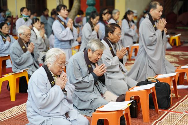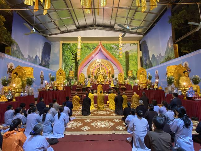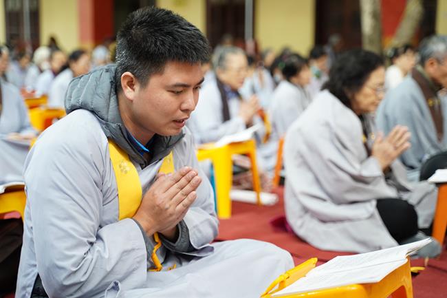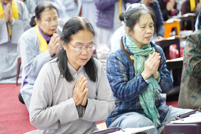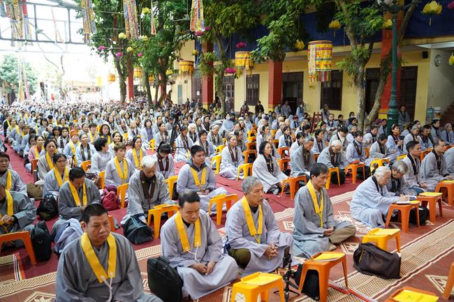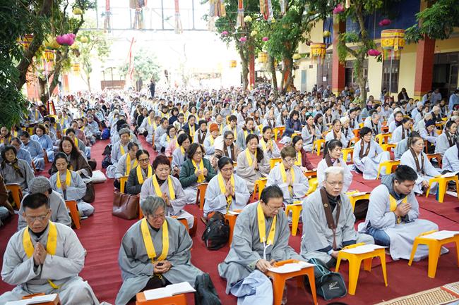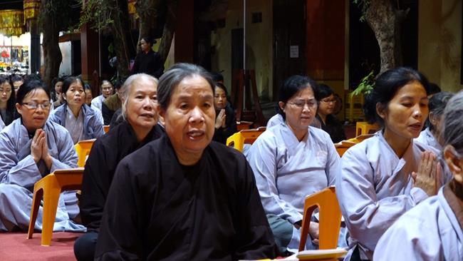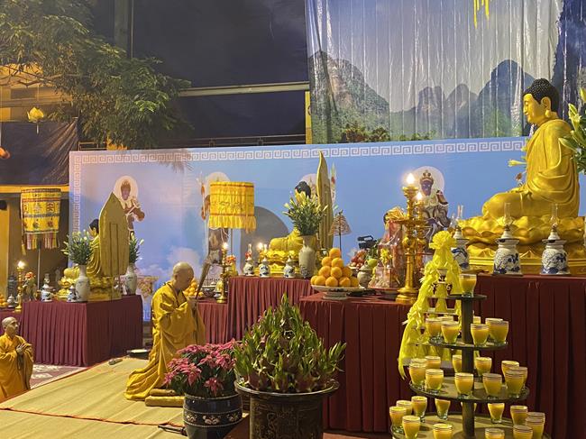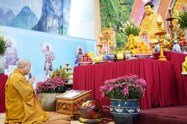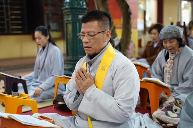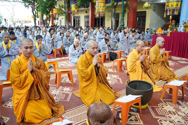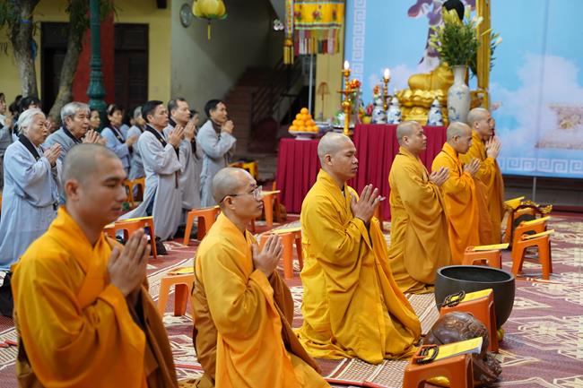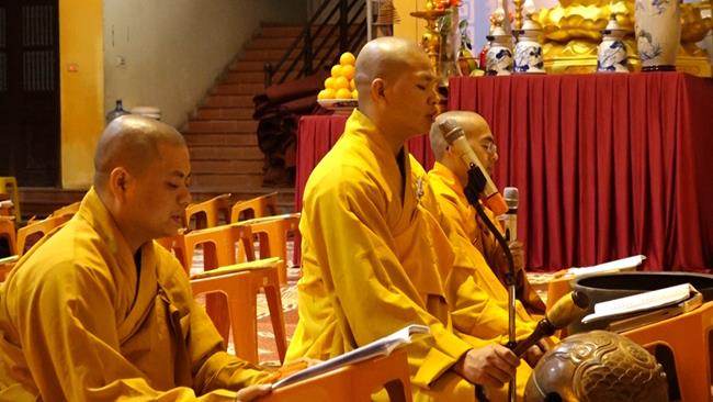 Sau đó, dưới sự chủ lễ của Hòa thượng trụ trì cùng chư Tôn đức Tăng, đại chúng tiếp tục trì tụng kinh Dược Sư trong niềm chí thành chí kính của người con Phật, cầu nguyện Phật pháp trường tồn, dịch bệnh tiêu tan, thế giới hòa bình, nhân dân ấm no hạnh phúc.