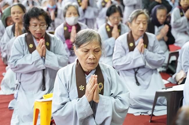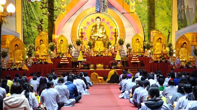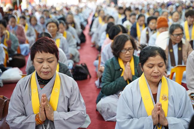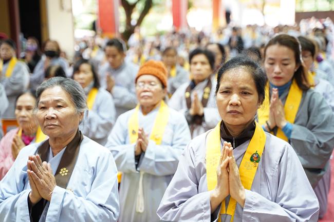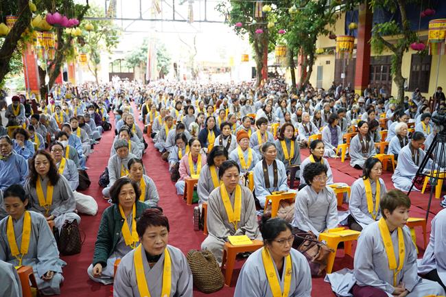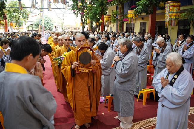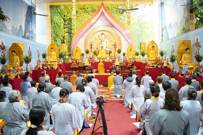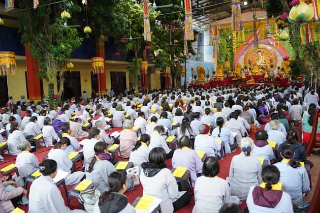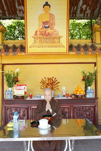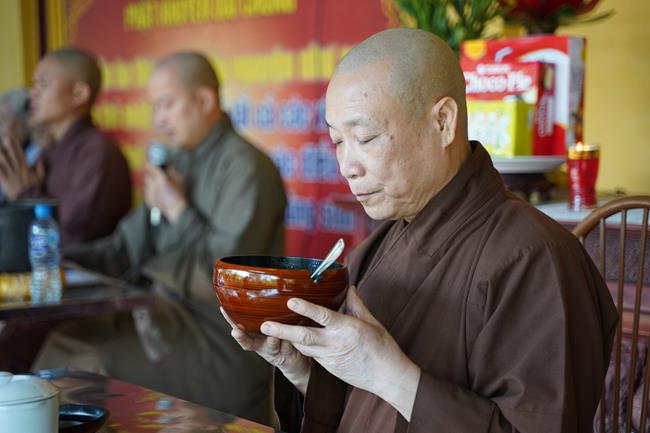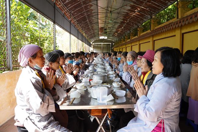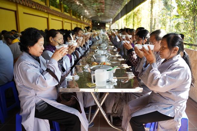Buổi trưa, đại chúng cùng thực hiện nghi thức Cúng Quá Đường, dùng cơm chay trong chính niệm, an lạc.