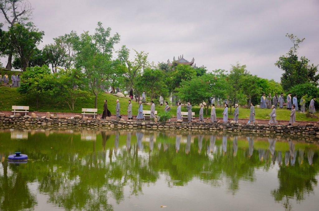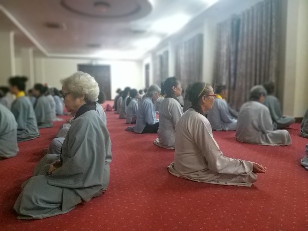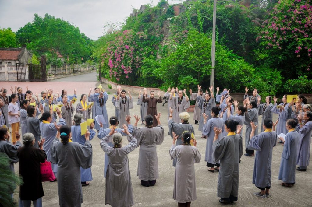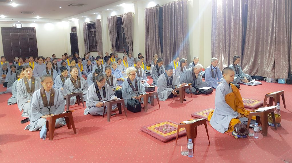 Chiều và tối thứ 7, đại chúng lễ sám hối hồng danh chư Phật và sám hối 6 căn theo nghi thức do vua Trần Thái Tông đời Trần đã soạn. Ngày chủ nhật, đại chúng thực tập các sinh hoạt như thường lệ: thiền tọa (thực tập quán chiếu lý vô thường), thiền hành, thiền ca, ăn cơm chính niệm, niệm Phật… dưới sự hướng dẫn của sư cô Thích Nữ Mai Anh.