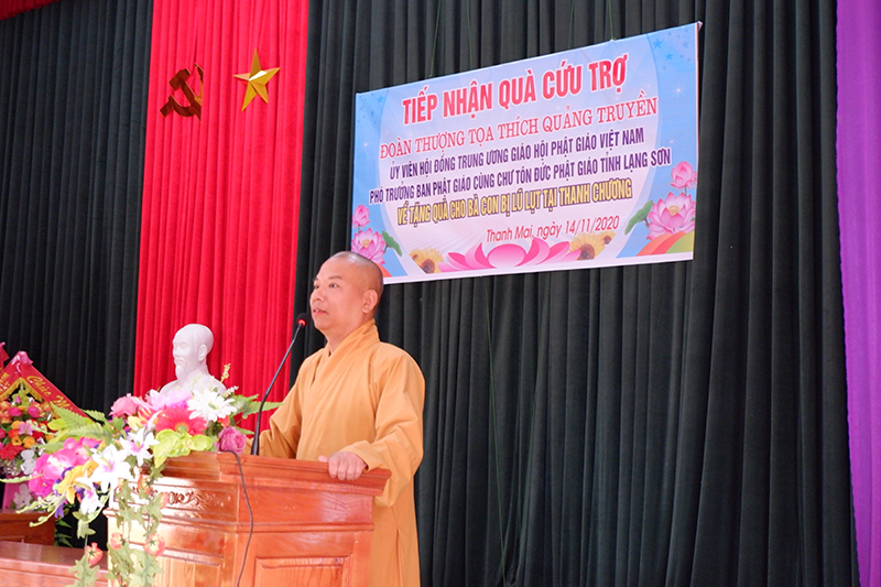 PSO - Trong các ngày 13 - 14/11/2020, phái đoàn Ban Trị sự GHPGVN tỉnh Lạng Sơn đã tổ chức đến thăm, tặng quà cho đồng bào 02 tỉnh Nghệ An và Hà Tĩnh chịu ảnh hưởng của bão lũ thời gian vừa qua. Dẫn đầu phái đoàn có TT. Thích Quảng Truyền - Ủy viên HĐTS, Phó Trưởng ban Thường trực Ban Trị sự GHPGVN tỉnh Lạng Sơn, chư Tôn đức Tăng và các vị Ủy viên trong Ban Trị Phật giáo tỉnh Lạng Sơn.