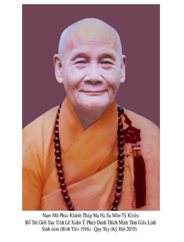 Được biết Trưởng lão HT. Thích Minh Tâm, thế danh Lê Xuân Ý, sinh năm 1916, tại xóm 1, thôn 5, xã Khánh Mậu, huyện Yên Khánh, tỉnh Ninh Bình. Thân phụ là cụ Lê Xuân Bồng, thân mẫu là cụ Phạm Thị Nhuận hiệu diệu Thuận. HT. được sinh ra trong một gia đình trung nông, phúc hậu, nhân từ, có nếp sống gia phong và kính tin Tam bảo. Hòa thượng là con út trong gia đình có 4 anh em trai. Năm 12 tuổi hội đủ duyên lành, Ngài theo thị giả Hòa thượng theo Đỗ Công Tác Đạo hiệu Tú Mậu đầu Phật xuất gia. Năm 15 tuổi Ngài được Hòa thượng Bản sư cho đăng đàn thụ Sa Di giới tại chùa Đỗ Linh Quang lấy Pháp hiệu là Minh Tâm. Năm tuổi đời đủ 20, tâm Bồ đề đã đơm bông, trí tuệ ứng thụ cụ túc. Để viên mãn tam đàn giới pháp, năm 1936 Ngài được Thầy Bản sư cho đăng đàn cầu Cụ túc giới tại Tổ đình Hưng Long (chùa Phúc Chỉnh, TP. Ninh Bình. Giới châu viên mãn, tiếp nối dòng thiền Lâm Tế, Sơn môn Phúc Hào- Vân Bòng. Từ đây Ngài chính thức đứng vào hàng Tăng bảo, trở thành sứ giả Như Lai, gánh vác Phật sự hoằng pháp lợi sinh.