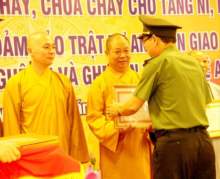 Nhân dịp này, Ban Giám đốc Công an tỉnh đã trao tặng giấy khen cho 01 tập thể và 05 cá nhân thuộc Ban Trị sự GHPGVN tỉnh, đã có nhiều thành tích xuất sắc trong phong trào toàn dân bảo vệ An ninh Tổ quốc và tặng quà an toàn giao thông cho tất cả chư Tôn đức Tăng Ni, Phật tử.