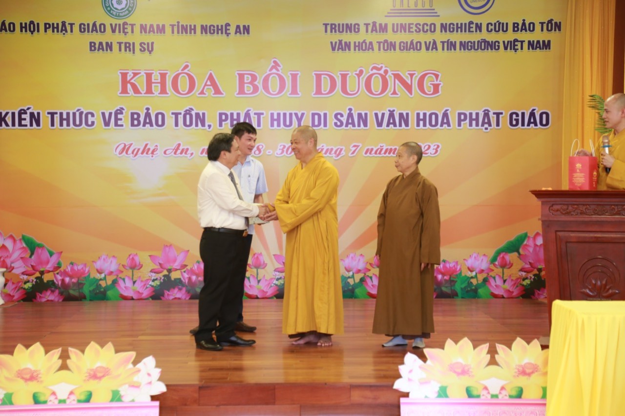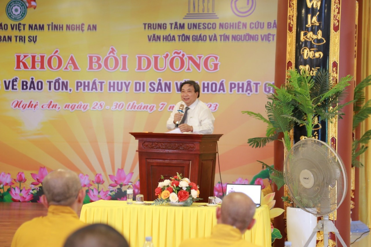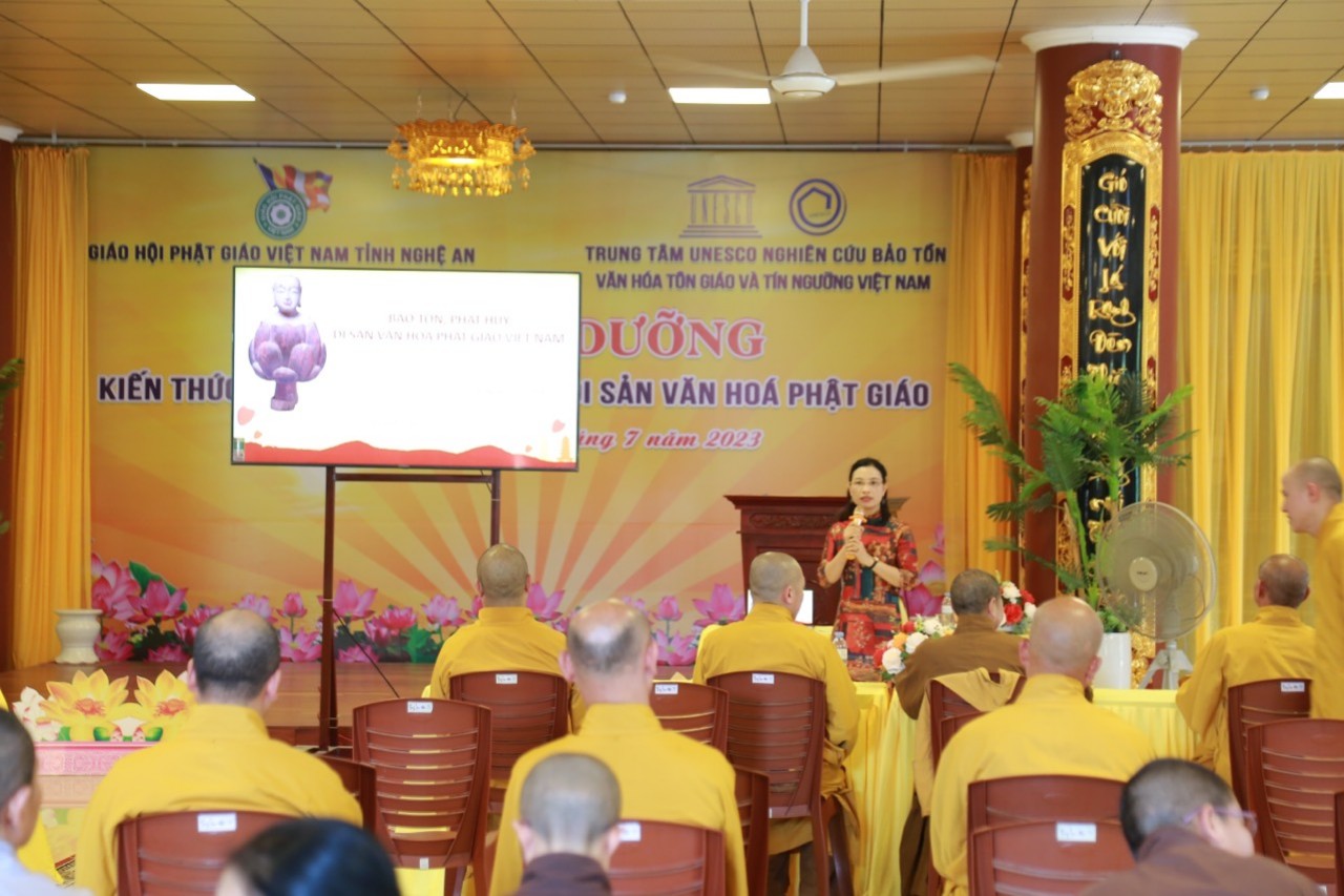 PSO - Sáng ngày 28/07/2023 (nhằm ngày 11/06/Quý Mão) tại chùa Diệc - Trụ sở Văn phòng BTS GHPGVN tỉnh Nghệ An (phường Quang Trung, TP. Vinh, Nghệ An) đã tổ chức khai mạc Khóa bồi dưỡng về bảo tồn phát huy Di sản văn hóa Phật giáo do BTS GHPGVN tỉnh Nghệ An phối hợp với Bảo tàng lịch sử Quốc gia Việt Nam và Trung tâm UNESCO Nghiên cứu bảo tồn văn hóa tôn giáo và tín ngưỡng Việt Nam.