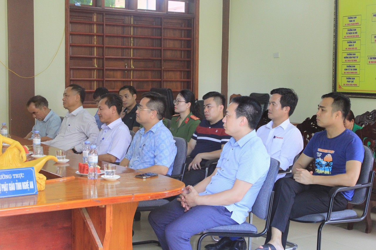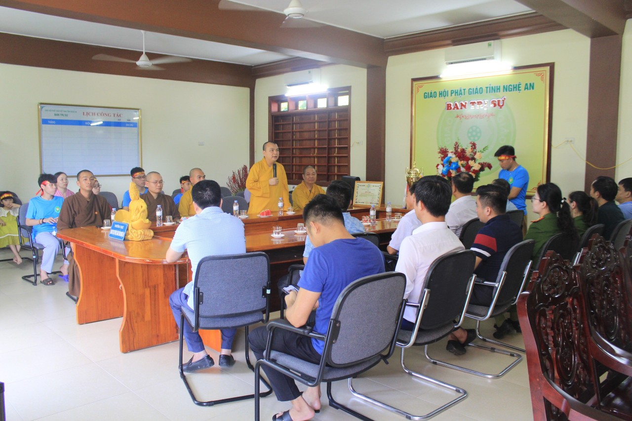 Tiếp đón đoàn có HT. Thích Thọ Lạc – Phó Trưởng ban TT Ban Trị sự GHPGVN tỉnh; ĐĐ. Thích Minh Hải – Chánh Văn phòng Tỉnh hội, Phó Trưởng ban TT Ban Hướng dẫn Phật tử tỉnh; ĐĐ. Thích Minh Định – Phó Văn phòng Tỉnh hội; ĐĐ. Thích Tuệ Phúc – Chánh Thư ký Ban HDPT Trưởng Phân ban Thanh thiếu nhi, cùng Chư Tôn đức và đại diện các bạn Trại sinh của Đoàn Nghệ An.