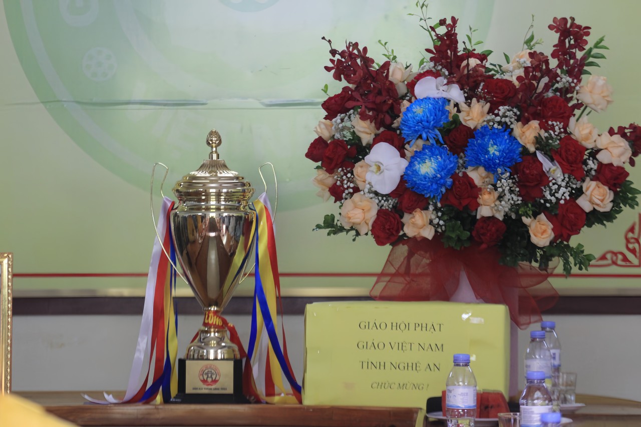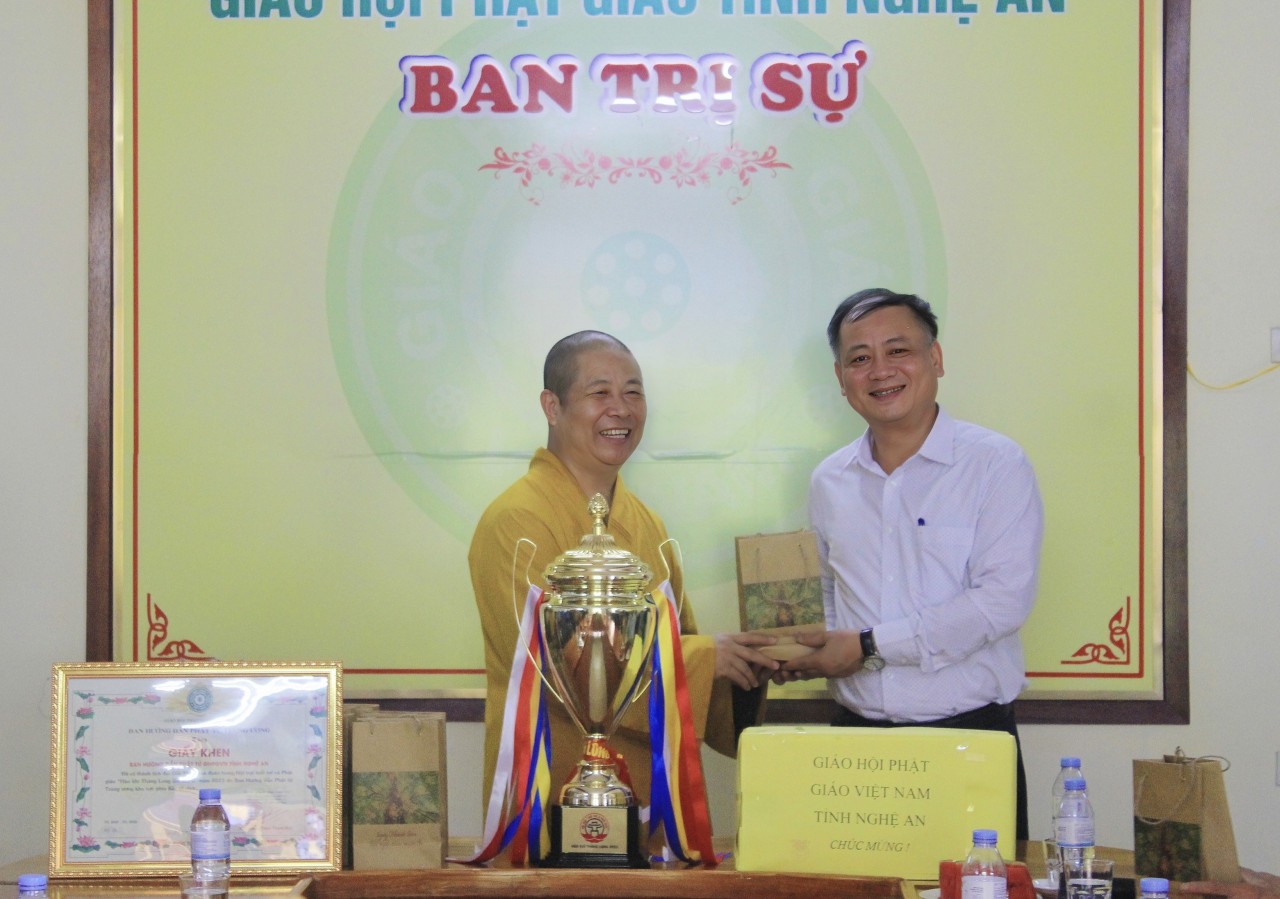 PSO - Sáng ngày 30/6/2023 (nhằm ngày 13/5/ Quý Mão), tại Trụ sở Tỉnh hội (Chùa Diệc, thành phố Vinh, Nghệ An), Ban Trị sự GHPGVN tỉnh tổ chức tiệc Liên hoan chúc mừng thành công Hội nghị tập huấn chuyên đề an ninh trật tự, phòng cháy chữa cháy và ký kết đảm bảo trật tự an toàn giao thông; Hội nghị phổ biến pháp luật cho Tăng Ni, Phật tử tiêu biểu trên địa bàn tỉnh. Đặc biệt, chúc mừng Ban Hướng dẫn Phật tử Nghệ An đã xuất sắc đạt cúp vàng Hội trại “Hào khí Thăng Long” lần thứ 2 tại Thủ đô Hà Nội do Ban Hướng dẫn Phật tử Trung ương tổ chức từ ngày 24 đến ngày 27/6/2023 cho 24 đơn vị tỉnh, thành phía Bắc.