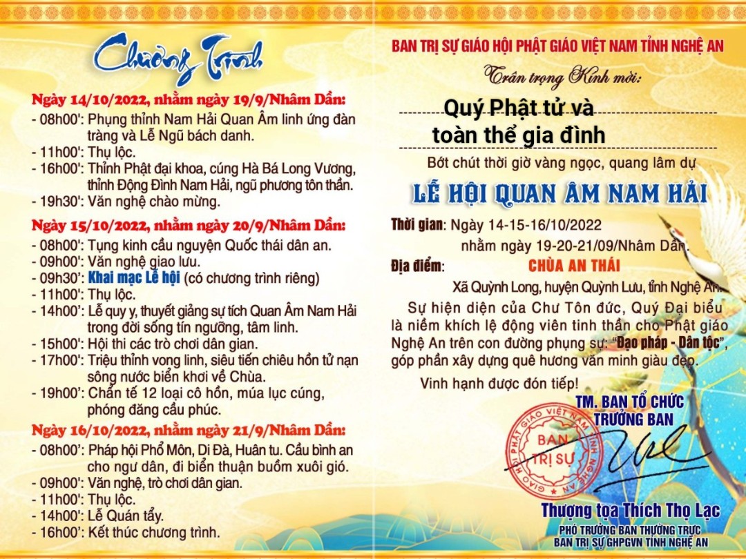 UBND huyện Quỳnh Lưu đã có Công văn số 2045/UBND-NV về việc tổ chức lễ hội Quan Âm Nam Hải tại chùa An Thái. UBND huyện đã yêu cầu các phòng ban chuyên trách của huyện, Công an huyện và UBND các xã Quỳnh Long và xã Quỳnh Thuận; Bộ đội biên phòng Quỳnh Thuận phối hợp giúp đỡ, tạo điều kiện thuận lợi để cho lễ hội diễn ra an toàn và đúng quy định của pháp luật.