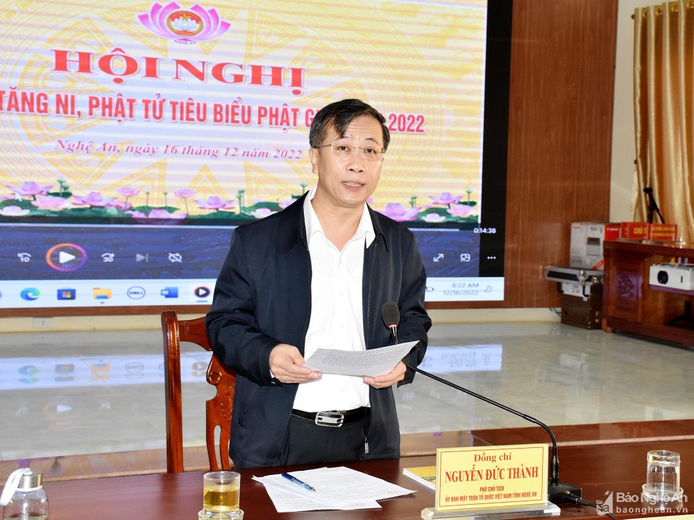 PSO - Sáng 16/12, tại trụ sở Ủy ban MTTQVN tỉnh Nghệ An, Ủy ban MTTQ tỉnh tổ chức Hội nghị gặp mặt, lắng nghe tiếng nói của các Tăng Ni, Phật tử tiêu biểu trên địa bàn tỉnh. Tham dự có Đồng chí Nguyễn Đức Thành – Phó Chủ tịch Ủy ban MTTQ tỉnh Nghệ An chủ trì hội nghị; đại diện lãnh đạo Ban Dân vận Tỉnh ủy, Công an tỉnh, Sở Tài nguyên và Môi trường, Sở Văn hóa và Thể thao, Sở Xây dựng, Ban Tôn giáo – Sở Nội vụ; Ban Trị sự GHPG tỉnh; đại diện các tổ chức Chính trị - xã hội tỉnh; đại diện Ban Thường trực Ủy ban MTTQ các huyện/thành/thị có các cơ sở Phật giáo và đại diện các Tăng Ni, Phật tử tiêu biểu. Đại diện Ban Trị sự Phật giáo tỉnh Nghệ An có Đại đức Thích Châu Phong, Phó chánh Văn phòng Tỉnh hội, Trưởng ban Pháp chế tham dự phát biểu y kiến: Phật giáo Nghệ An có khoảng 150.000 Phật tử, sinh hoạt ở 71 chùa và 1 niệm Phật đường, 526 đạo tràng, bản hội, dưới sự hướng dẫn của 109 Tăng Ni, tu sĩ; có 40/71 chùa có sư trụ trì, 15 chùa có ban hộ tự, 11 chùa có người đại diện; 14/21 huyện, thành, thị có chùa, còn 1 thị xã và 6 huyện miền núi chưa có chùa nhưng ở địa phương đã có đạo tràng cho phật tử tu tập, sinh hoạt Phật giáo. Năm 2022, Ủy ban MTTQ các cấp đã phối hợp tuyên truyền, vận động bà con phật tử chấp hành các chủ trương, chính sách của Đảng, pháp luật của Nhà nước và các quy định của địa phương. Phối hợp giúp đỡ tổ chức Đại hội đại biểu Phật giáo tỉnh lần thứ III; tuyên truyền, vận động hưởng ứng các cuộc vận động, các phong trào thi đua yêu nước. Tăng Ni, Phật tử và các chùa đã tích cực hỗ trợ tiền, hiện vật, giúp đỡ người nghèo đón Tết Nhâm Dần 2022, hỗ trợ xây dựng nhà đại đoàn kết cho hộ nghèo, góp phần thực hiện công tác an sinh xã hội. Tính đến ngày 30/11, công tác từ thiện – nhân đạo, an sinh xã hội, phúc lợi cộng đồng của Phật giáo trong tỉnh ước đạt trên 12 tỷ đồng. Thời gian tới Ủy ban MTTQ các cấp tiếp tục tuyên truyền, vận động các chức sắc, Tăng Ni, Phật tử chấp hành tốt chủ trương, chính sách của Đảng, pháp luật của Nhà nước. Triển khai có hiệu quả các cuộc vận động, phong trào thi đua yêu nước; thực hiện tốt chương trình phối hợp với Ban Trị sự GHPG tỉnh. Tại hội nghị, Tăng Ni, Phật tử đã chia sẻ ý kiến và tâm tư, nguyện vọng liên quan đến hoạt động tôn giáo và các lĩnh vực của đời sống như đẩy nhanh tiến độ cấp Quyền sử dụng đất cho các cơ sở tôn giáo; thủ tục mở rộng quy mô, khuôn viên chùa; mở đạo tràng cho các phật tử tu tập trong thời gian chưa có chùa; ghi thành phần tôn giáo vào hồ sơ cá nhân; cách thức lan tỏa công tác thiện nguyện và an sinh xã hội. Phát biểu tại hội nghị, Đồng chí Nguyễn Đức Thành đã ghi nhận những y kiến tâm tư nguyện vọng và đề xuất của các Tăng Ni, tu sĩ, Phật tử và hứa sẽ kiến nghị các cơ quan chức năng giải quyết nhằm đảm bảo quyền và lợi ích hợp pháp của mọi người dân,nhất là người nghèo. Qua đó chăm lo khối đại đoàn kết toàn dân, tăng cường mối đoàn kết giữa các tôn giáo, đảm bảo quyền tự do tín ngưỡng, góp phần xây dựng quê hương ngày càng giàu đẹp văn minh. ...