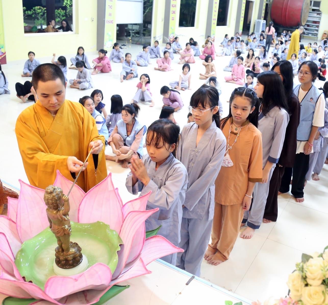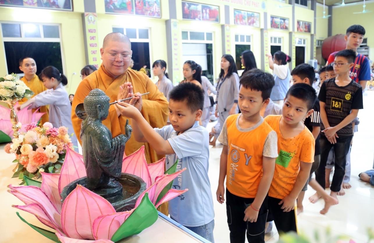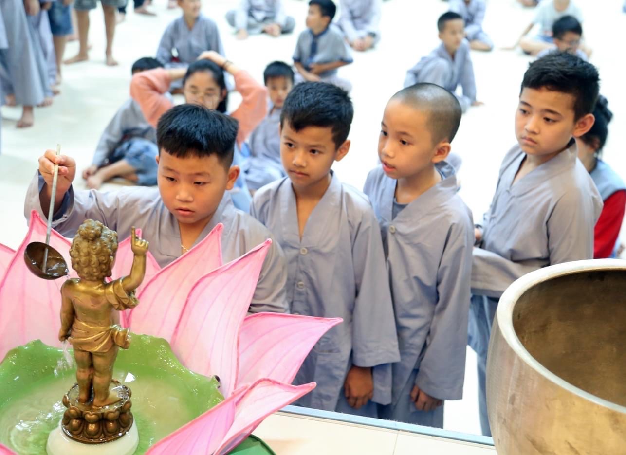 Ngoài các hoạt động tu học, ngồi thiền, học kinh, vui chơi, thì tối ngày 05/06/2023, Khoá Tu được quý Thầy tổ chức tụng Kinh Chuyển Pháp Luân và thực hiện nghi thức Tắm Phật nhân mùa Phật đản 2023.