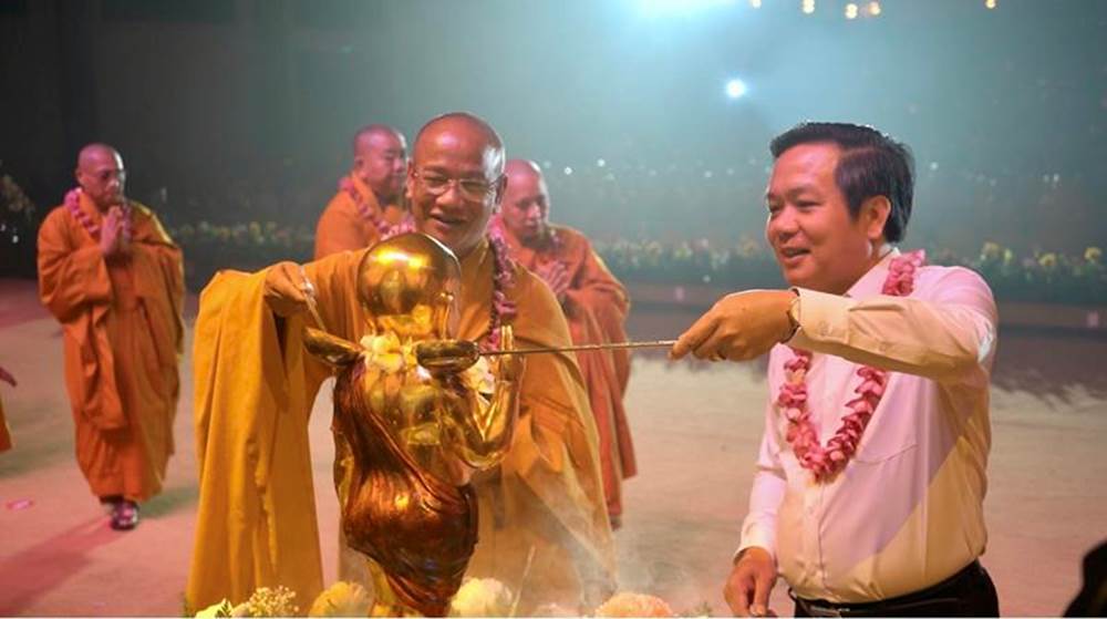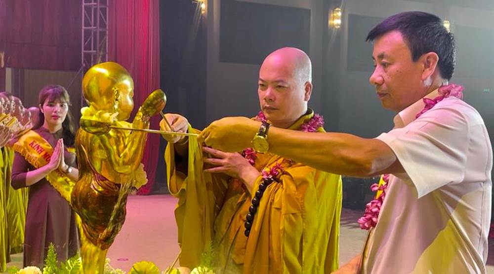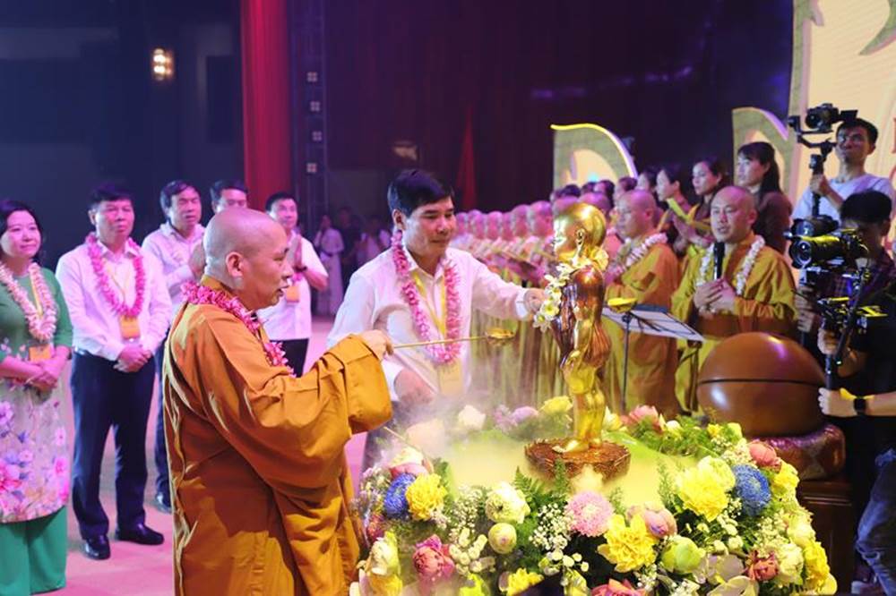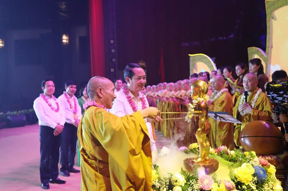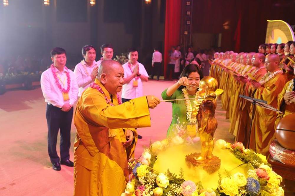 Cuối buổi lễ chư Tôn đức cùng quý vị đại biểu thực hiện nghi thức tụng kinh Khánh đản, Nghi thức tắm Phật và văn nghệ chủ đề “Đất nước hòa ca kính mừng Phật đản”.