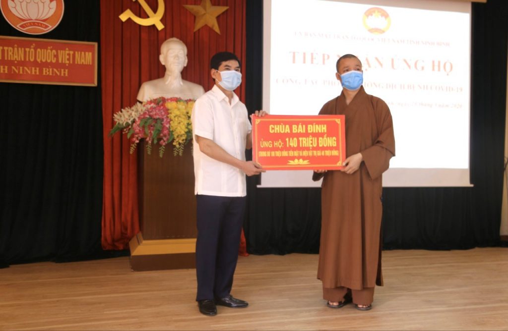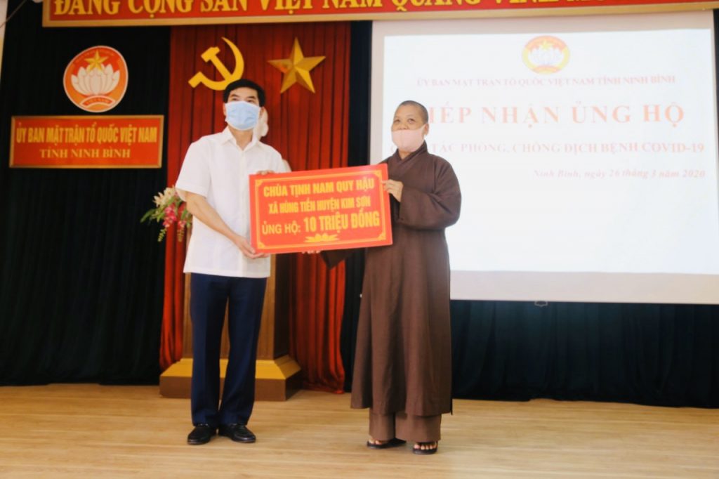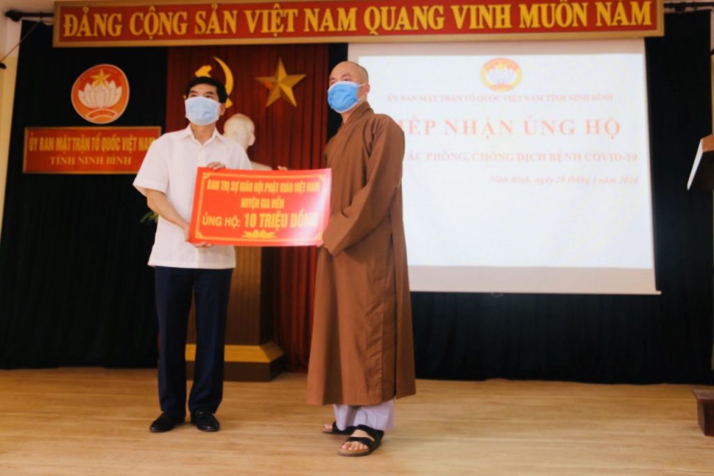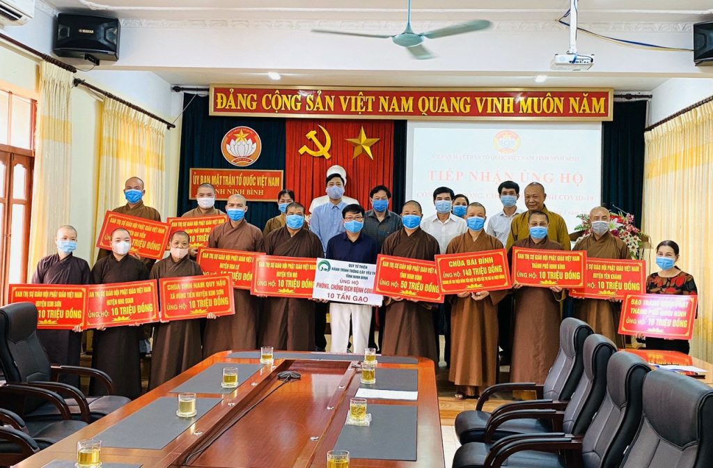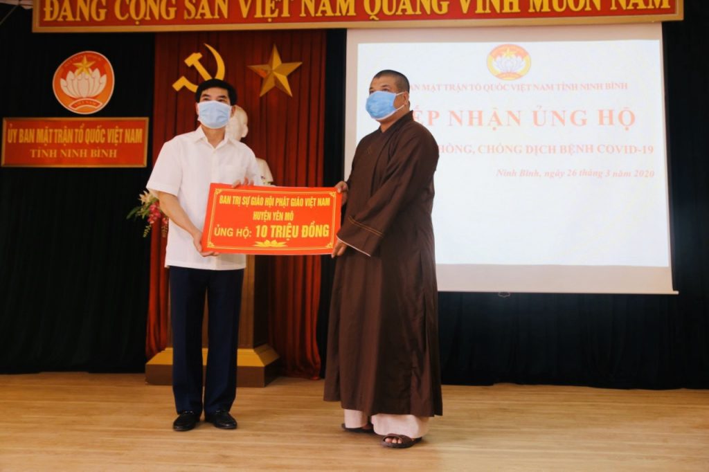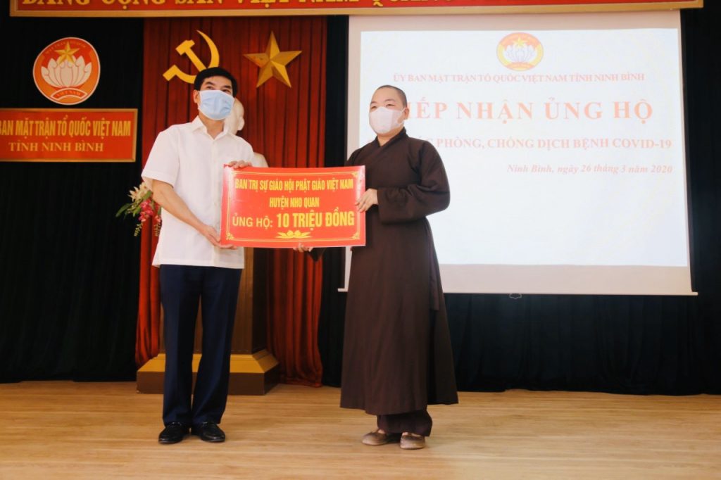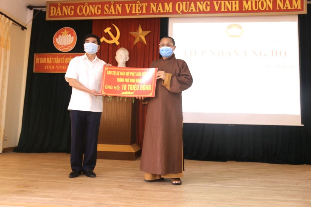 Thay mặt Ban Thường trực Ban Trị sự GHPGVN tỉnh, Thượng tọa Thích Thọ Lạc - Ủy viên Thư ký HĐTS, Trưởng ban Văn hóa Trung ương GHPGVN, Trưởng BTS GHPGVN tỉnh Ninh Bình; Thượng tọa Thích Minh Quang - Phó Văn phòng 1 TƯGH, Phó ban kiêm Chánh Thư ký BTS GHPGVN tỉnh Ninh Bình cùng đại diện GHPGVN các huyện và thành phố trong tỉnh đã đến trao tặng tổng số tiền hơn 250 triệu đồng, 1 mạnh thường quân ủng hộ 10 tấn gạo và phẩm vật là sữa, nước ngọt cùng 4.000 khẩu trang 3M tại Ủy ban MTTQVN tỉnh Ninh Bình.