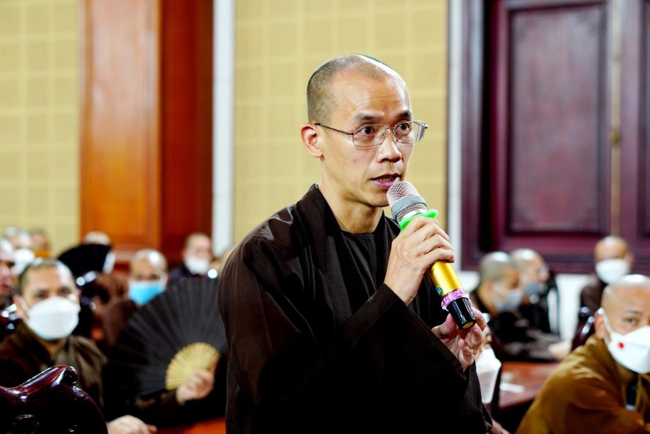 GS.Lương Gia Tĩnh, Phó Viện trưởng, Trưởng phòng Đào tạo Học viện thay mặt Hội đồng điều hành và Học viên nói lời cảm ơn đến PGS.TS Nguyễn Hoàng Hải cùng nhiều quý học giả, nhà nghiên cứu, giáo sư giảng sư khoa Triết học trường Đại học Khoa học Xã hội và Nhân văn (Đại học Quốc gia Hà Nội) đã đến thăm và chia sẻ chuyên đề với Tăng Ni sinh tại Học viện.