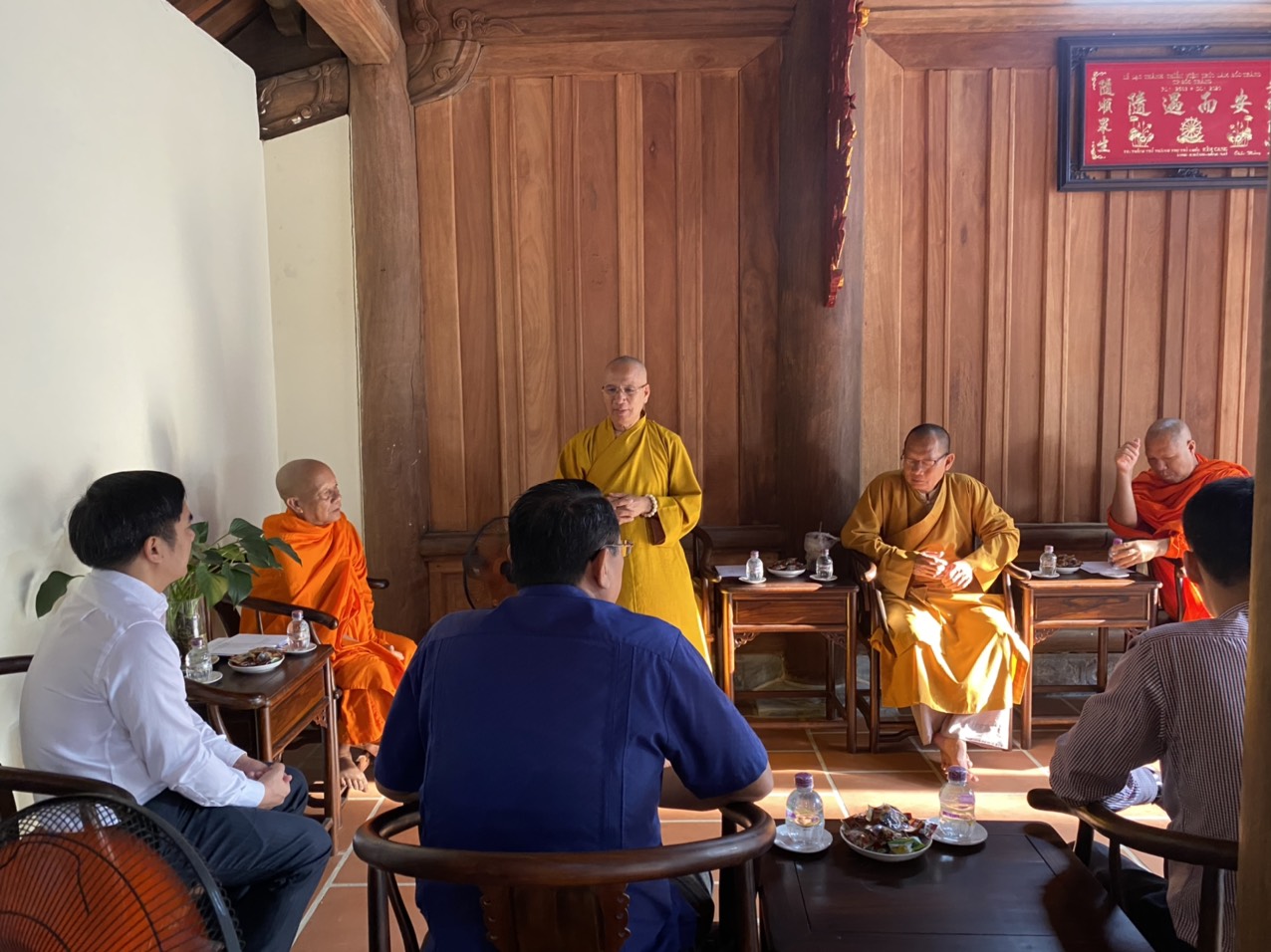 Thân mật tiếp đoàn có HT.Tăng Nô - Ủy viên Thường trực HĐTS, Phó ban Kiểm soát TƯ, Trưởng BTS GHPGVN tỉnh Sóc Trăng; HT.Thích Minh Hạnh - Ủy viên HĐTS, Phó trưởng Ban Thường trực BTS Phật giáo tỉnh; HT.Thích Minh Thành - Ủy viên HĐTS, Phó BTS, Trưởng ban Pháp chế; TT.Lý Đức - Ủy viên HĐTS, Phó BTS, Trưởng ban Kiểm soát; ĐĐ.Thích Thiện Nguyện - Chánh Thư ký cùng chư Tôn đức Văn phòng BTS GHPGVN tỉnh Sóc Trăng.
