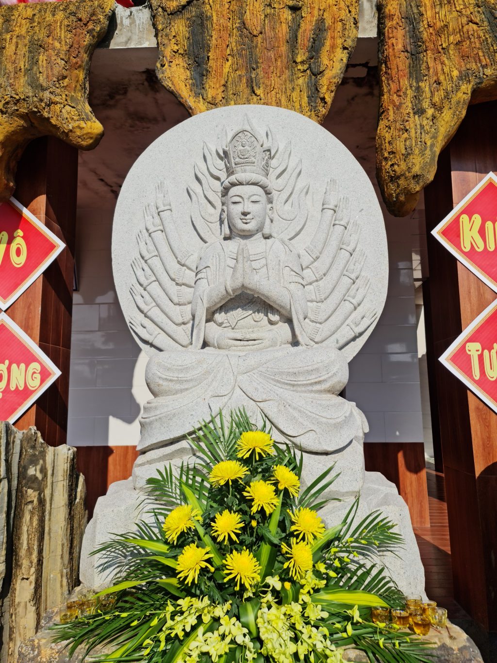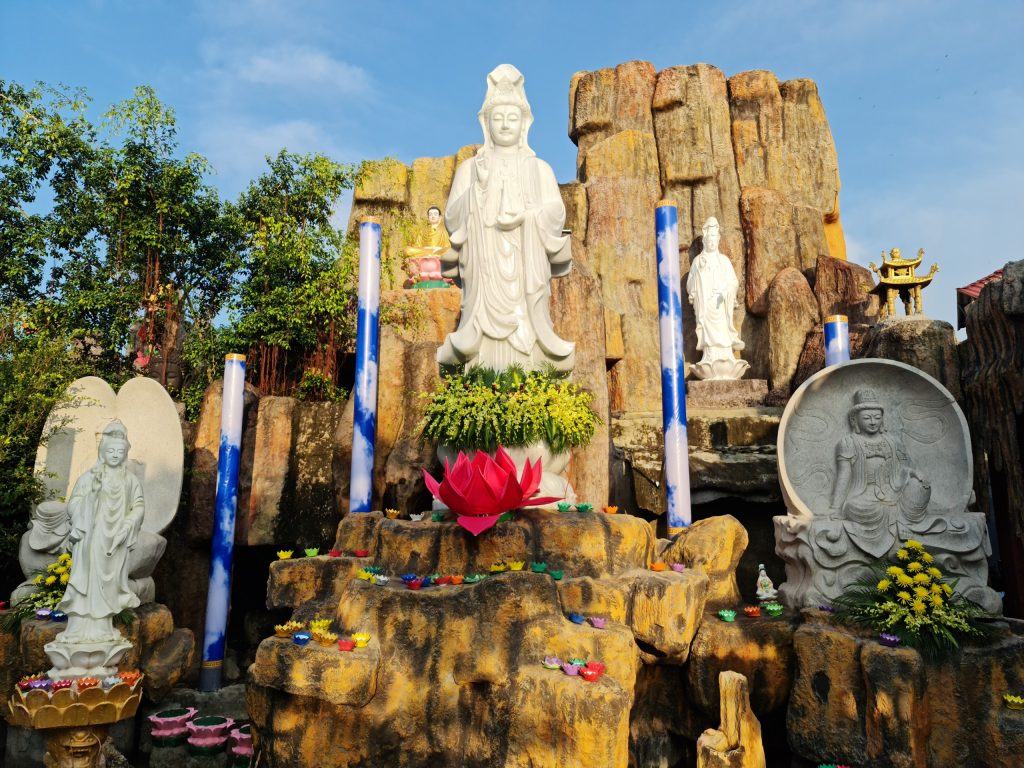 Tượng Bồ tát Quán Thế Âm cao 5 mét, chất liệu bằng đá Non nước Đà Nẵng. Tượng được an vị trên nền núi nhân tạo với kiến trúc độc đáo, mang đậm tính truyền thống theo tư tưởng Phật giáo Bắc truyền. Chung quanh là những hóa thân của Bồ tát Quán Thế Âm, thể hiện tinh thần độ sanh, lắng nghe và cứu khổ ban vui tất cả chúng sanh nếu mọi người phát tâm hướng về Ngài.