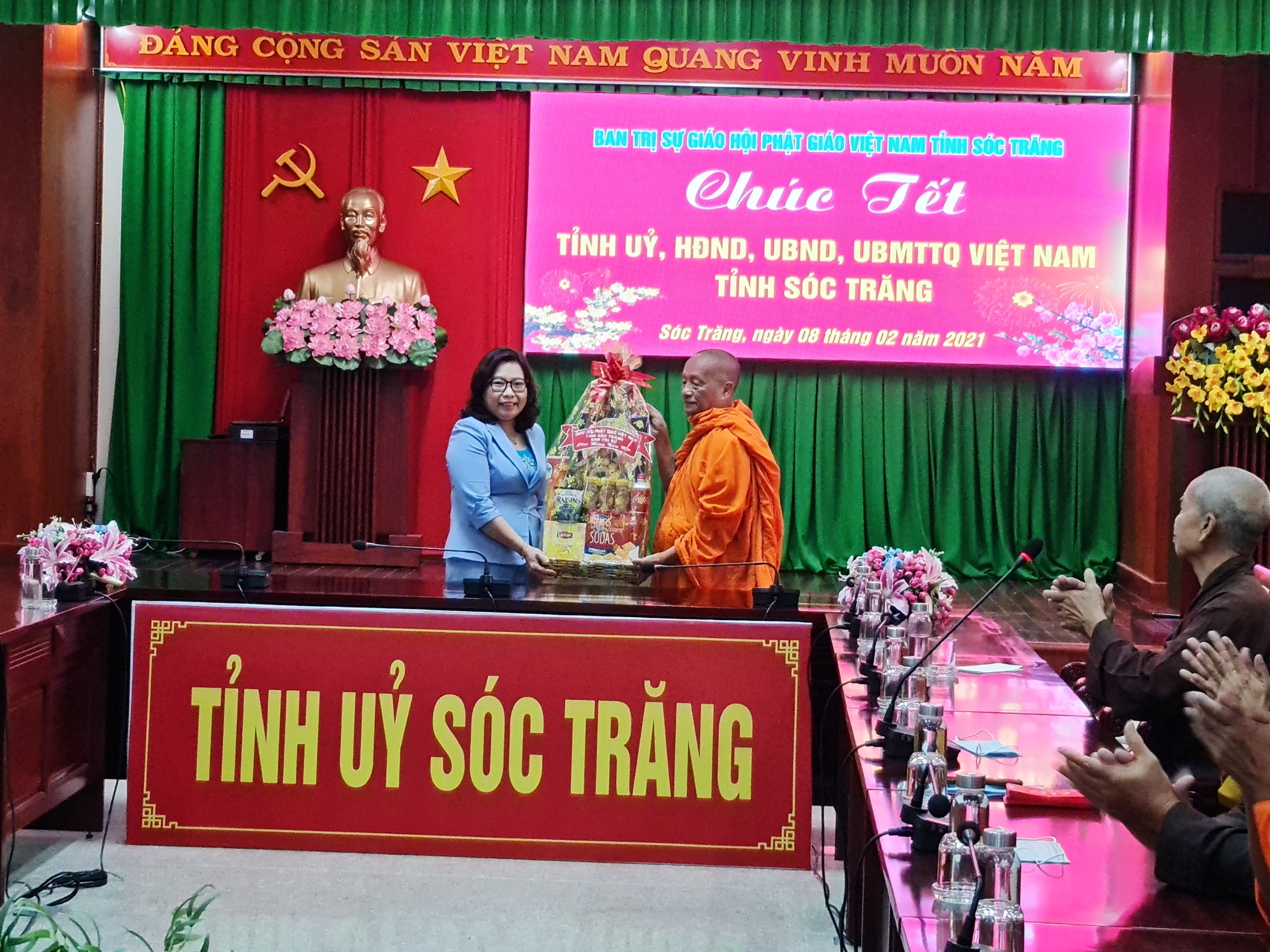 Bà Hồ Thị Cẩm Đào - Phó Bí thư Thường trực Tỉnh ủy Sóc Trăng phát biểuBà Hồ Thị Cẩm Đào - Phó Bí thư Thường trực Tỉnh ủy thay mặt Tỉnh ủy, HĐND, UBND, UB MTTQVN tỉnh phát biểu; cảm ơn chư Tôn đức lãnh đạo Phật giáo tỉnh đã đến thăm và chúc tết. Nhân đây, bà cũng báo cáo về sự thành công Đại hội XIII của TƯ Đảng. Sóc Trăng đang phát triển về kinh tế, văn hóa, xã hội. Ghi nhận sự đóng góp to lớn của Phật giáo Sóc Trăng đối với tỉnh. Trong năm 2021 hướng đến sự kiện quan trọng là bầu cử HĐND các cấp, bà hy vọng chư tôn đức lãnh đạo BTS Phật giáo tỉnh hướng dẫn tín đồ tích cực tham gia công tác tuyền truyền và thực thi bầu cử đầy đủ, làm tròn nghĩa vụ công dân.