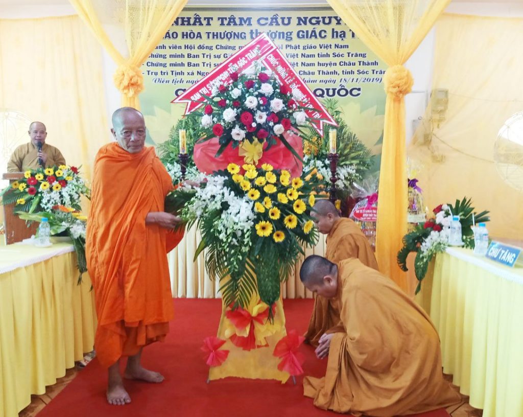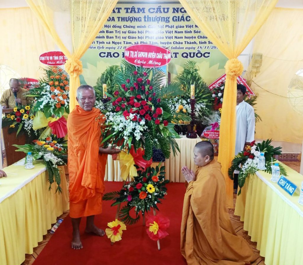 HT.Tăng Nô - UV Thường trực HĐTS, Phó ban Kiểm Soát TƯ, Trưởng BTS Phật giáo tỉnh Sóc Trăng trao lẵng hoa chúc mừng lễ bổ nhiệm Trụ trì