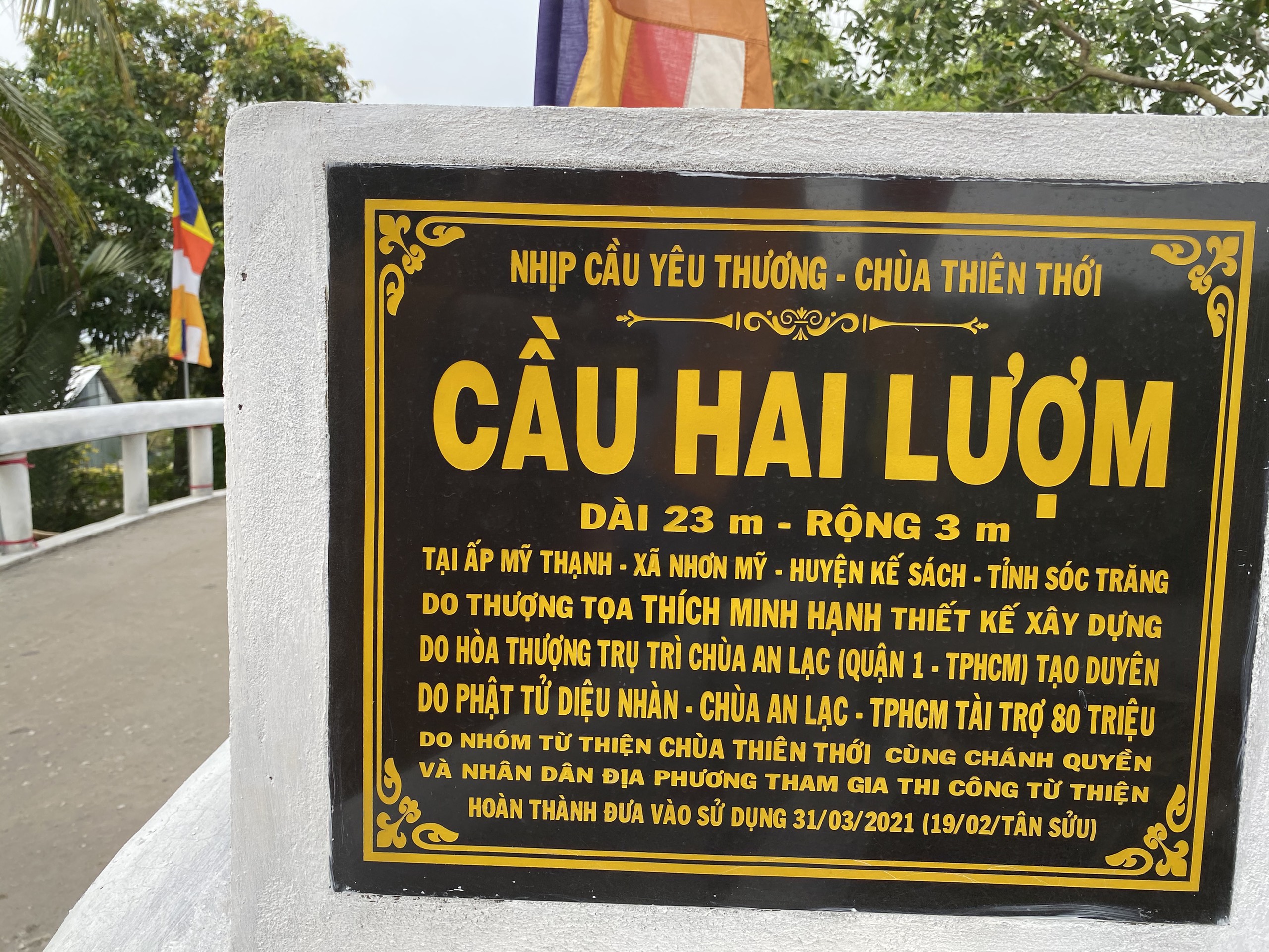 Cầu Hai Lượm dài 23 mét, rộng 3 mét tại ấp Mỹ Thành, xã Nhơn Mỹ. Cầu Mười Thương dài 23 mét, rộng 3,3 mét tại ấp 6, xã Ba Trinh. Hai cầu này thuộc huyện Kế Sách và đều được quý Phật tử chùa An Lạc tài trợ kinh phí vật tư.