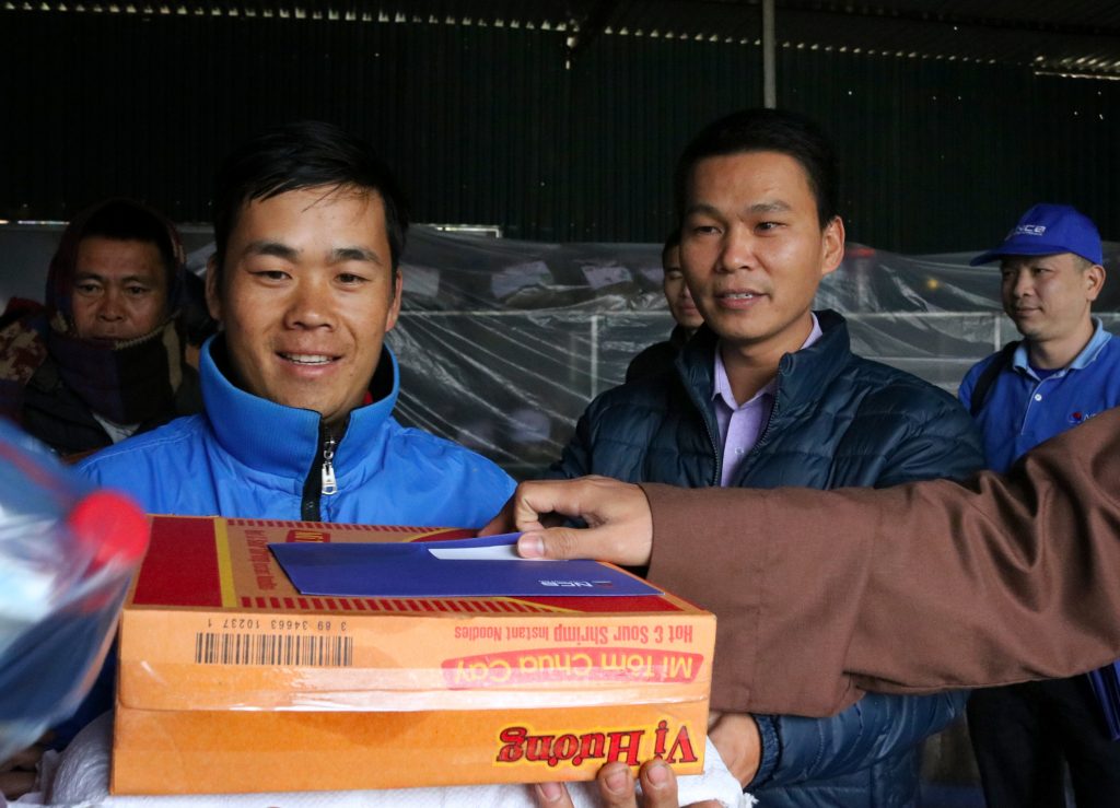 Phần quà gồm các nhu yếu phẩm: Gạo, mì gói, đường, bột ngọt, nước tương và tiền mặt. Mỗi phần quà trị giá khoảng 1 triệu đồng.