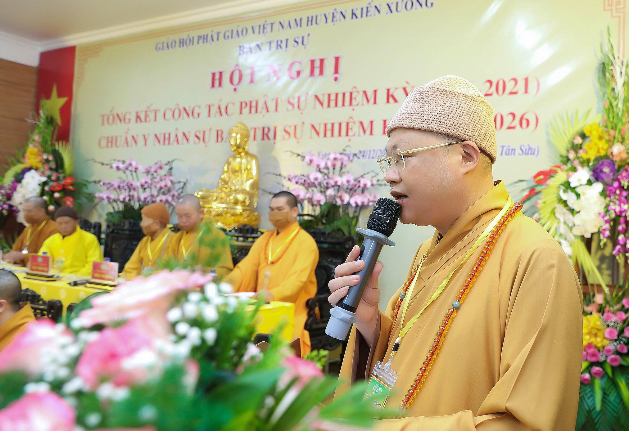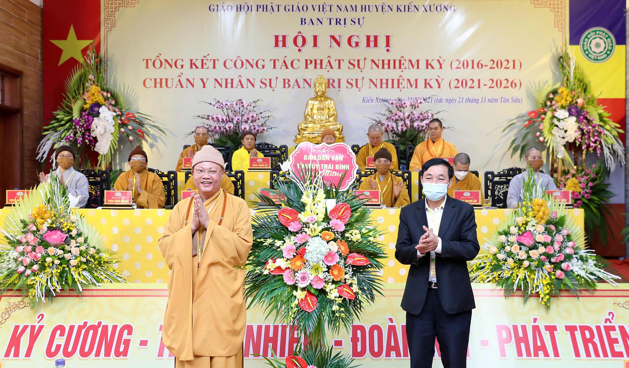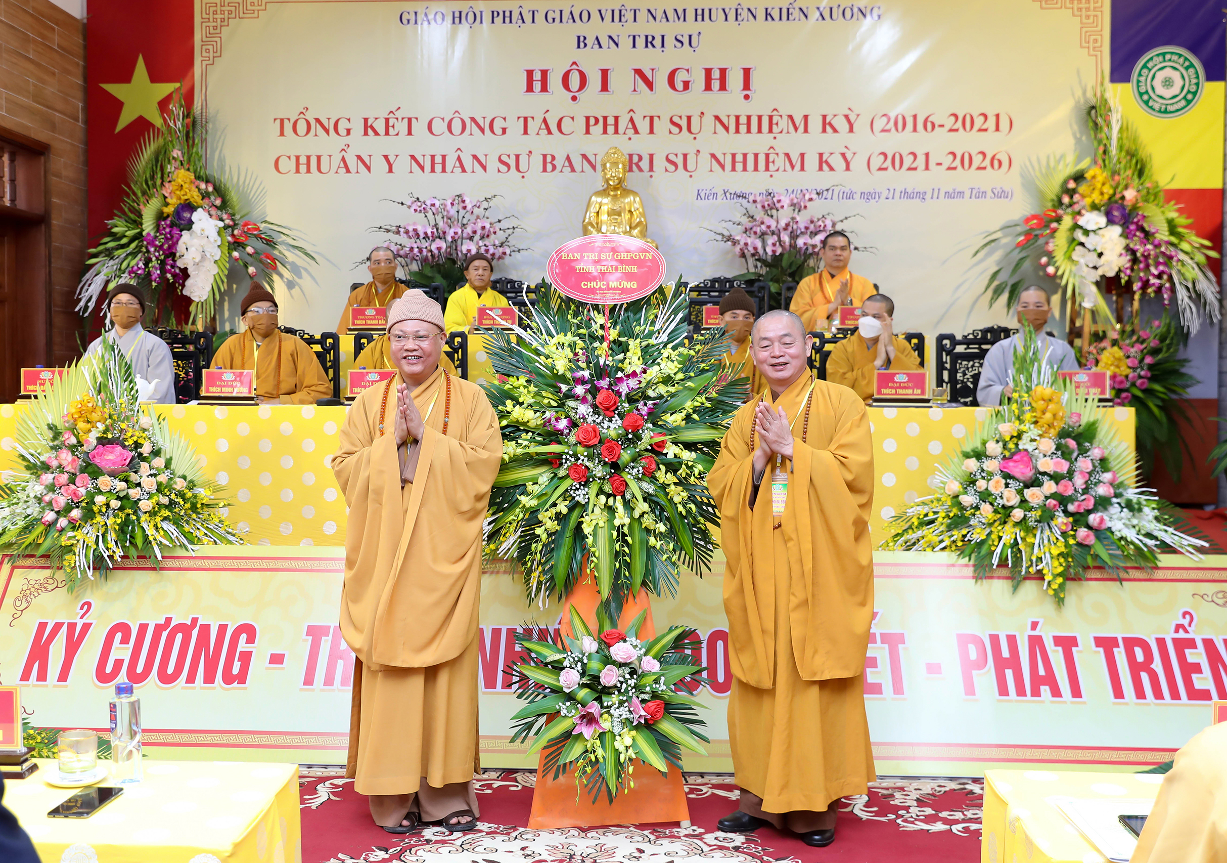 Trên bàn chủ tọa Đại hội có TT. Thích Thanh Vượng - Phó Trưởng ban Trị sự, Trưởng ban Văn hóa GHPGVN tỉnh, Trưởng BTS PG huyện Kiến Xương; TT. Thích Trí Sử - UV BTS, Trưởng BTS PG TP. Thái Bình; TT. Thích Thanh Bản - UV BTS, Trưởng BTS PG huyện Tiền Hải; ĐĐ. Thích Thanh Ân - Ủy viên BTS kiêm Chánh Thư ký, Trưởng ban TTTT PG tỉnh; Ni sư Thích Đàm Lương - Ủy viên BTS Trưởng ban Ni giới tỉnh, cùng các vị Tôn đức Tăng Ni đại diện Ban Trị sự 8 huyện thị trong tỉnh Thái Bình, huyện Kiến Xương cùng tham dự.