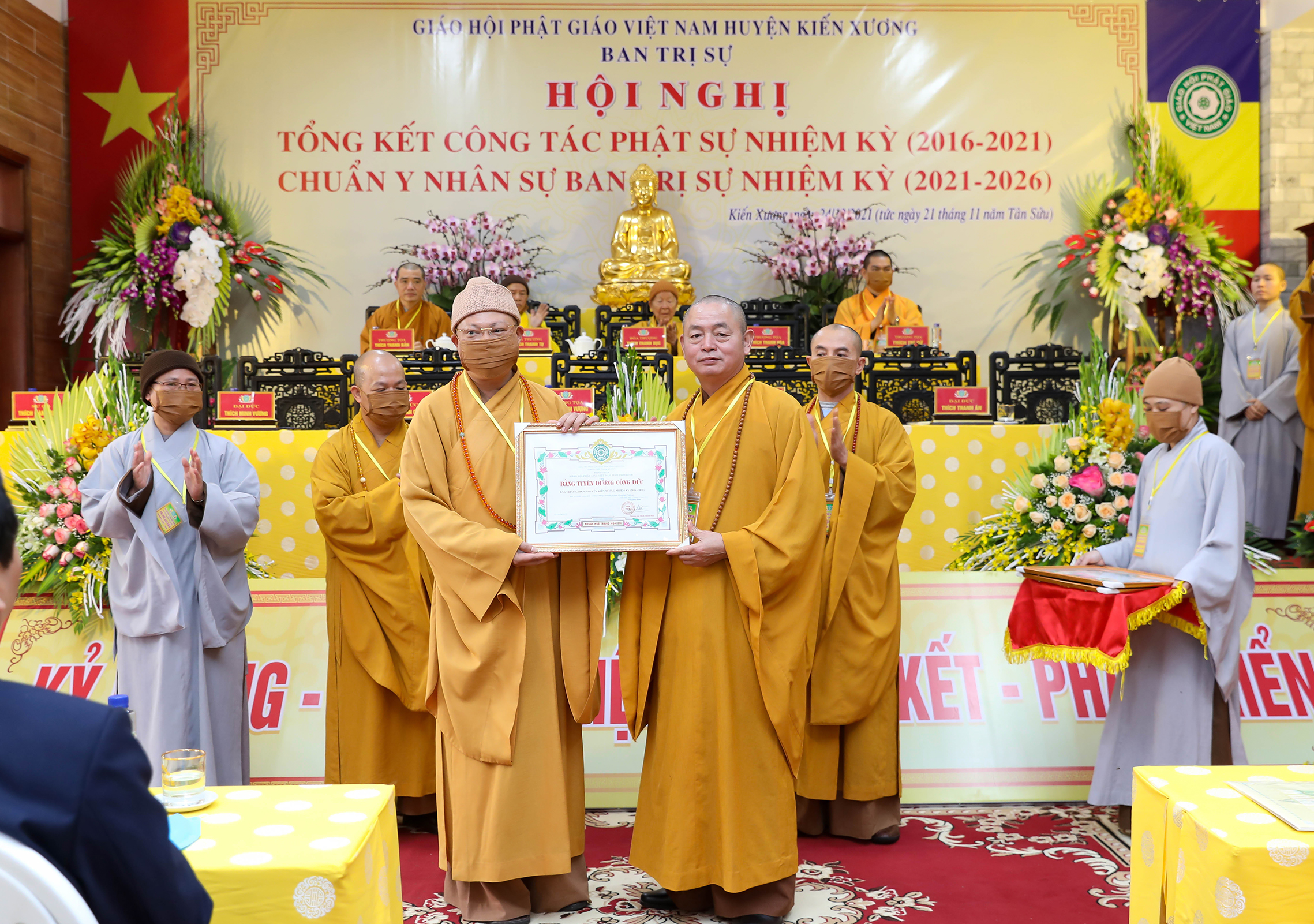 Với những thành tích đã đạt được trong các hoạt động Phật sự của nhiệm kỳ qua, TT. Thích Thanh Hòa - Trưởng ban Trị sự PG tỉnh Thái Bình đã phát biểu khen ngợi và trao tặng bằng khen, tuyên dương công đức cho các tập thể và cá nhân Tăng Ni có thành tích xuất sắc. Thượng toạ cũng đã khuyến tấn tới BTS và Tăng Ni Phật giáo Kiến Xương phải phát huy hơn nữa trí lực và dũng lực, tinh thần bồ tát đạo trong các hoạt động của nhiệm kỳ tới, luôn tạo được sự đồng thuận tập thể, đoàn kết gắn bó mật thiết với chính quyền địa phương, hòa hợp với cộng đồng xã hội cùng hội nhập và phát triển xứng đáng với niềm tin của nhân dân đồng bào.