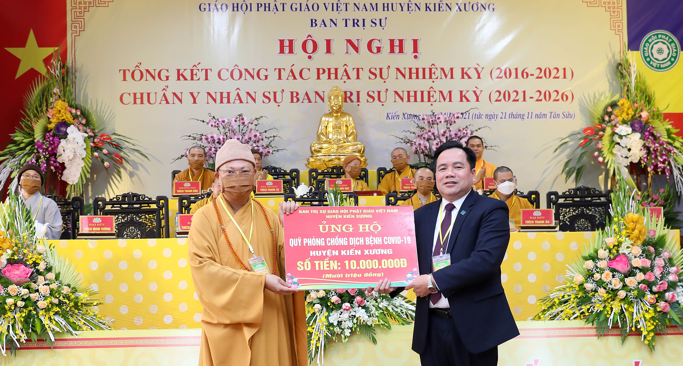 Với lòng từ bi của những người con Phật Thay mặt cho BTS nhiệm kỳ mới Phật giáo huyện Kiến Xương TT. Thích Thanh Vượng đã trao tặng cho quỹ vì người nghèo huyện Kiến Xương 10 triệu đồng và quỹ phòng chống dịch Covid-19 10 triệu đồng.