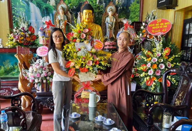 Đại diện ban Dân vận và Uỷ ban MTTQ huyện Tiền Hải tặng hoa chúc mừng TT.Thích Thanh Bản