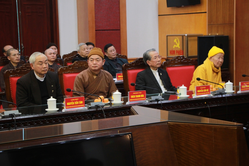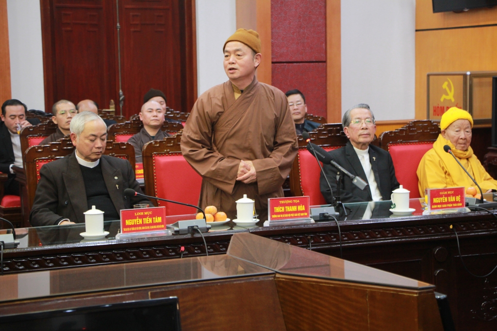 TT.Thích Thanh Hòa phát biểu ý kiếnCác vị chức sắc cũng gửi lời cảm ơn chân thành đến các cấp ủy đảng, chính quyền, MTTQ các cấp của tỉnh đã quan tâm, tạo mọi điều kiện thuận lợi để các tổ chức tôn giáo hoạt động đúng với tôn chỉ mục đích, tuân thủ các quy định của pháp luật, của địa phương và hứa sẽ tiếp tục đồng hành đóng góp chung vào sự phát triển kinh tế - xã hội của tỉnh. Nhân dịp năm mới Tân Sửu 2021, các vị đại biểu chức sắc cũng chúc các đồng chí lãnh đạo tỉnh và các ngành chức năng của tỉnh một năm mới an khang, hạnh phúc.