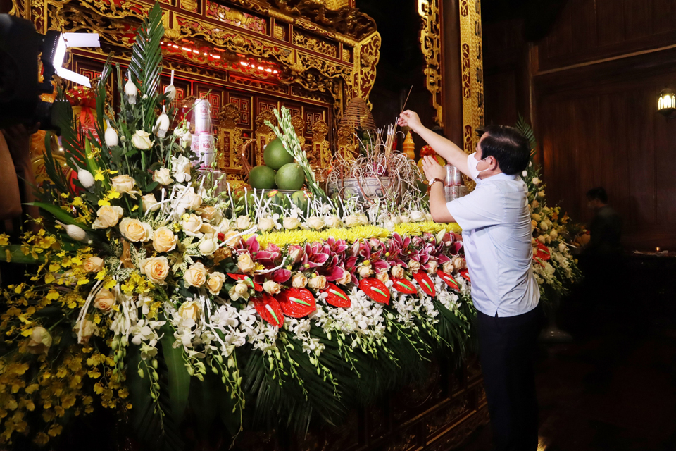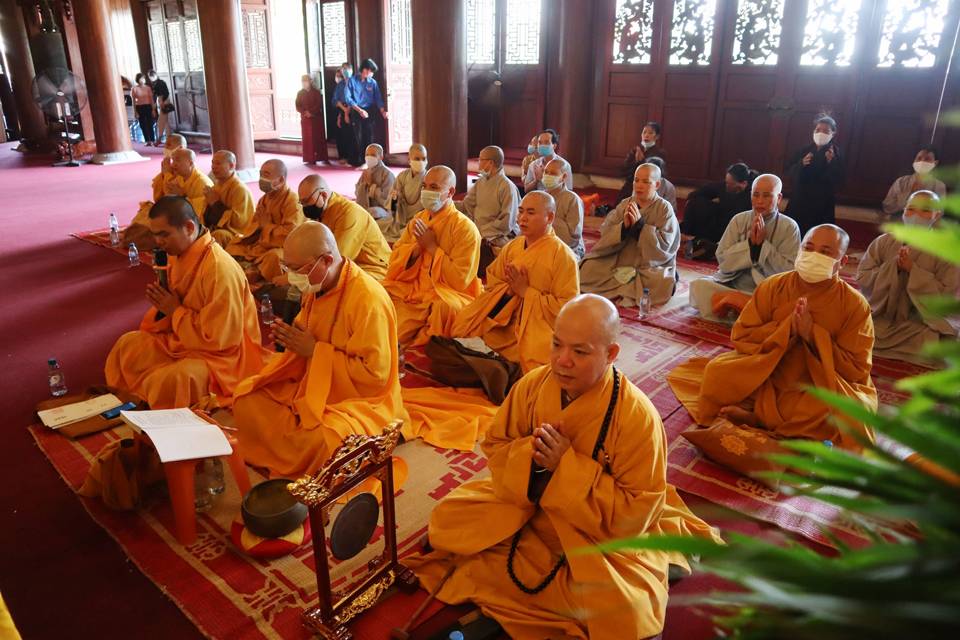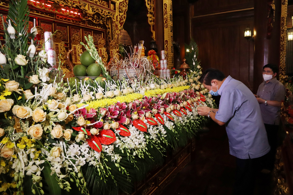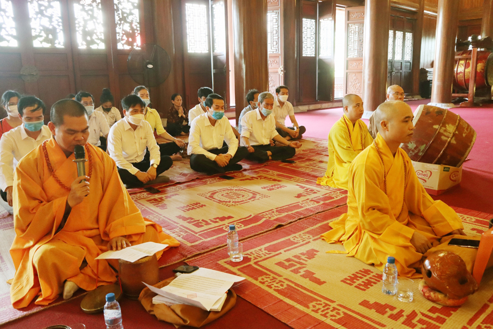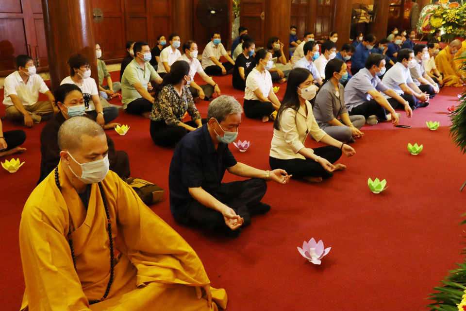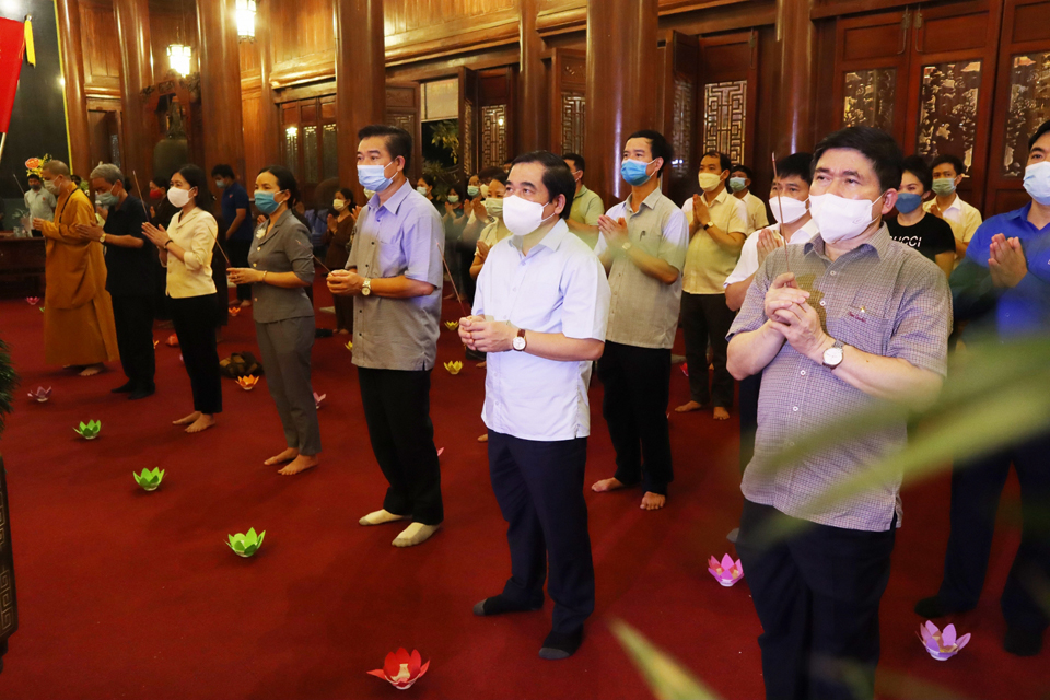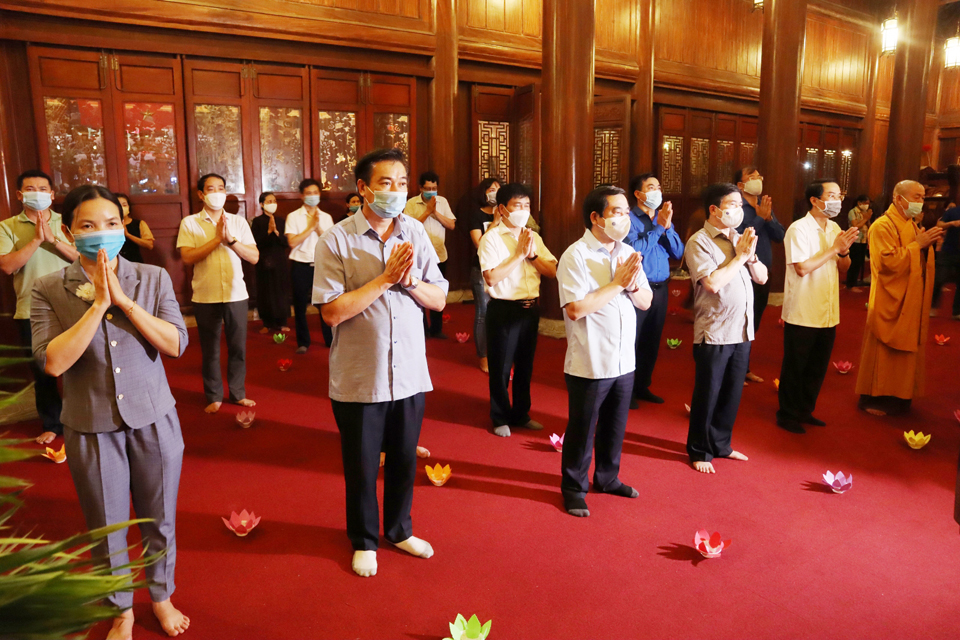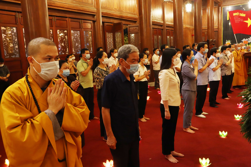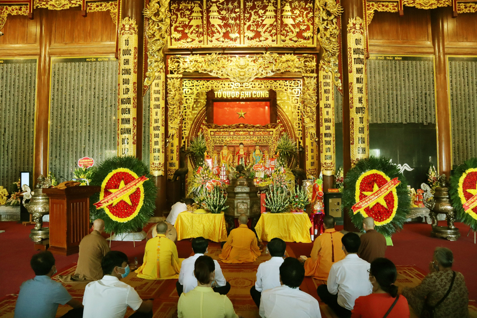 Tiếng tụng kinh trầm hùng vang lên trong không gian linh thiêng, mênh mông tại đền thờ liệt sĩ tỉnh Thái Bình, đại chúng đã nhất tâm cầu nguyện cho hương linh các liệt sỹ sớm siêu sinh Lạc quốc, cầu cho đất nước phồn thịnh, dịch bệnh COVID-19 tiêu trừ và nhân dân được sống trong an lành, hạnh phúc.