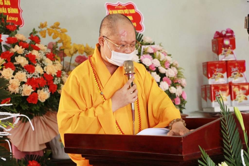 Tiếp đó, TT. Thích Thanh Vượng - Phó BTS Phật giáo tỉnh, tuyên đọc diễn văn Phật đản của Hòa thượng Chủ tịch HĐTS, nhấn mạnh: “Trong không khí hân hoan kính mừng ngày Đức Phật đản sinh, tất cả người con Phật trên hành tinh này hãy cùng nhau thực hiện lý tưởng và lời dạy của Đức Phật, tinh tấn tu tập Giới Định Tuệ thông qua con đường Bát Chánh đạo, luôn tôn trọng sự sống và môi trường sống của muôn loài, khuyến khích mối liên hệ tương giao, hòa bình giữa con người với con người, giữa con người với các loài cộng sinh, chung sống hòa hợp trên nền tảng Từ, Bi, Hỷ, Xả đem lại đời sống hỷ lạc không khổ đau. Trong Đại kinh Khổ uẩn thuộc Trung bộ kinh, Đức Phật nhắc nhỡ các vị Tỳ kheo: “…Này các Tỳ kheo, do dục làm nhân, do dục làm duyên sanh ra tranh đoạt… Một khi đã tranh chấp, tranh luận, tranh đoạt đi đến công phá nhau, ở đây họ đi đến tử vong, đi đến sự đau khổ gần như tử vong…”.