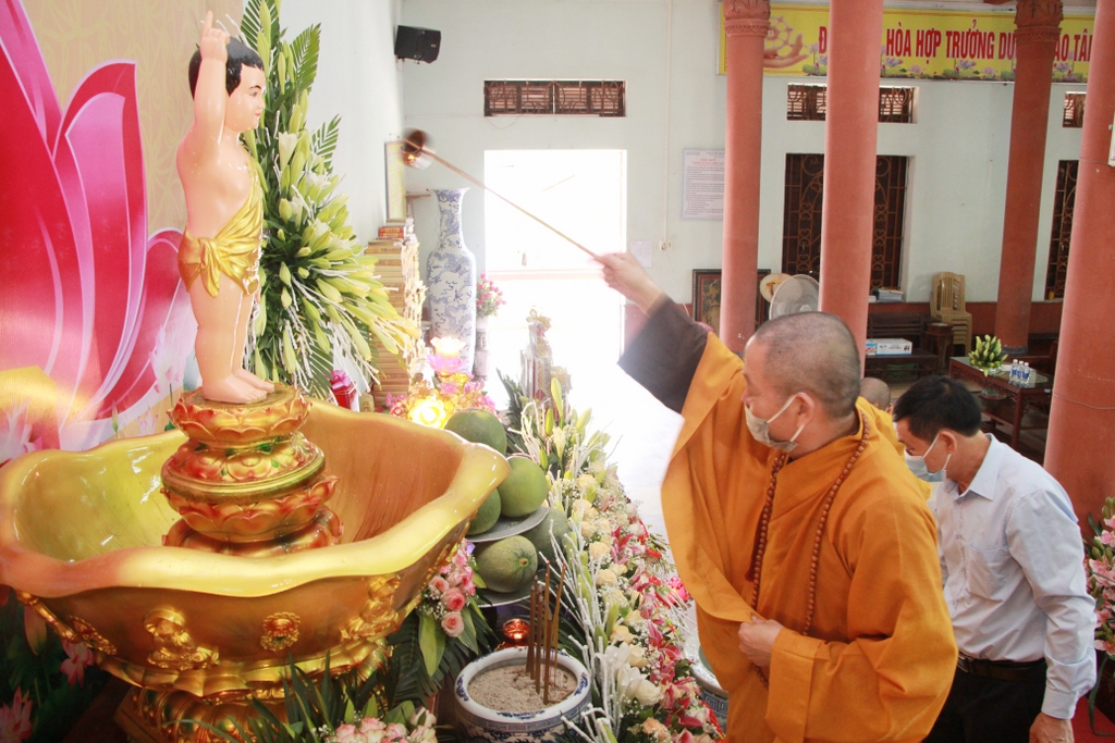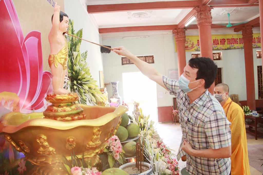 Sau khi tặng hoa chúc mừng, chư Tôn đức Tăng Ni, quý đại biểu chính quyền các cấp, Phật tử đã tham gia các nghi thức tại buổi lễ như: niêm hương, nhất tâm tụng bài sám Khánh đản thành kính dâng cúng dàng, Tắm Phật,… để cầu cho quốc thái dân an, thế giới hòa bình, đất nước phồn vinh, thịnh vượng, cầu nguyện nhân loại chóng vượt qua đại dịch COVID-19.