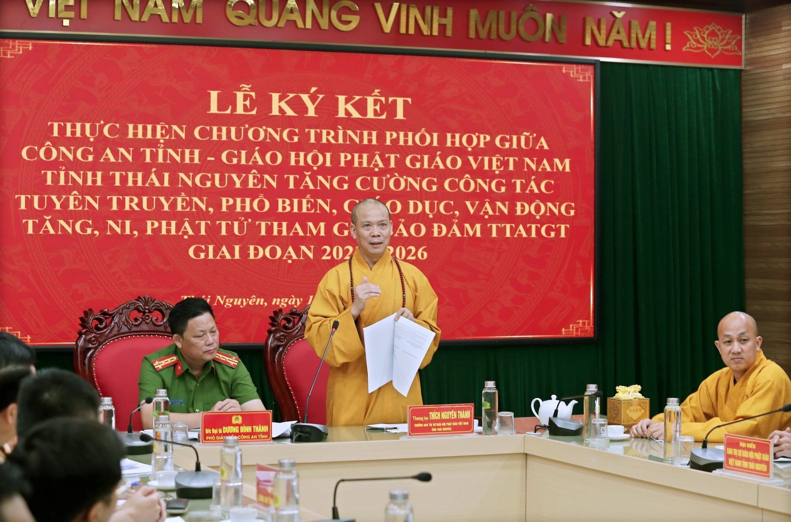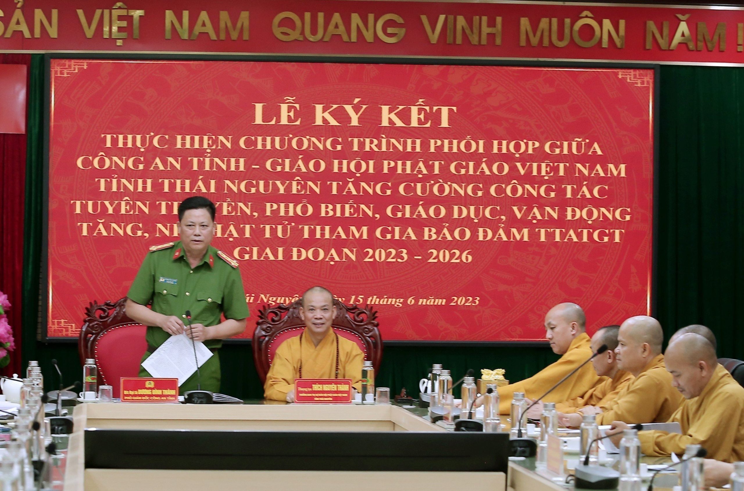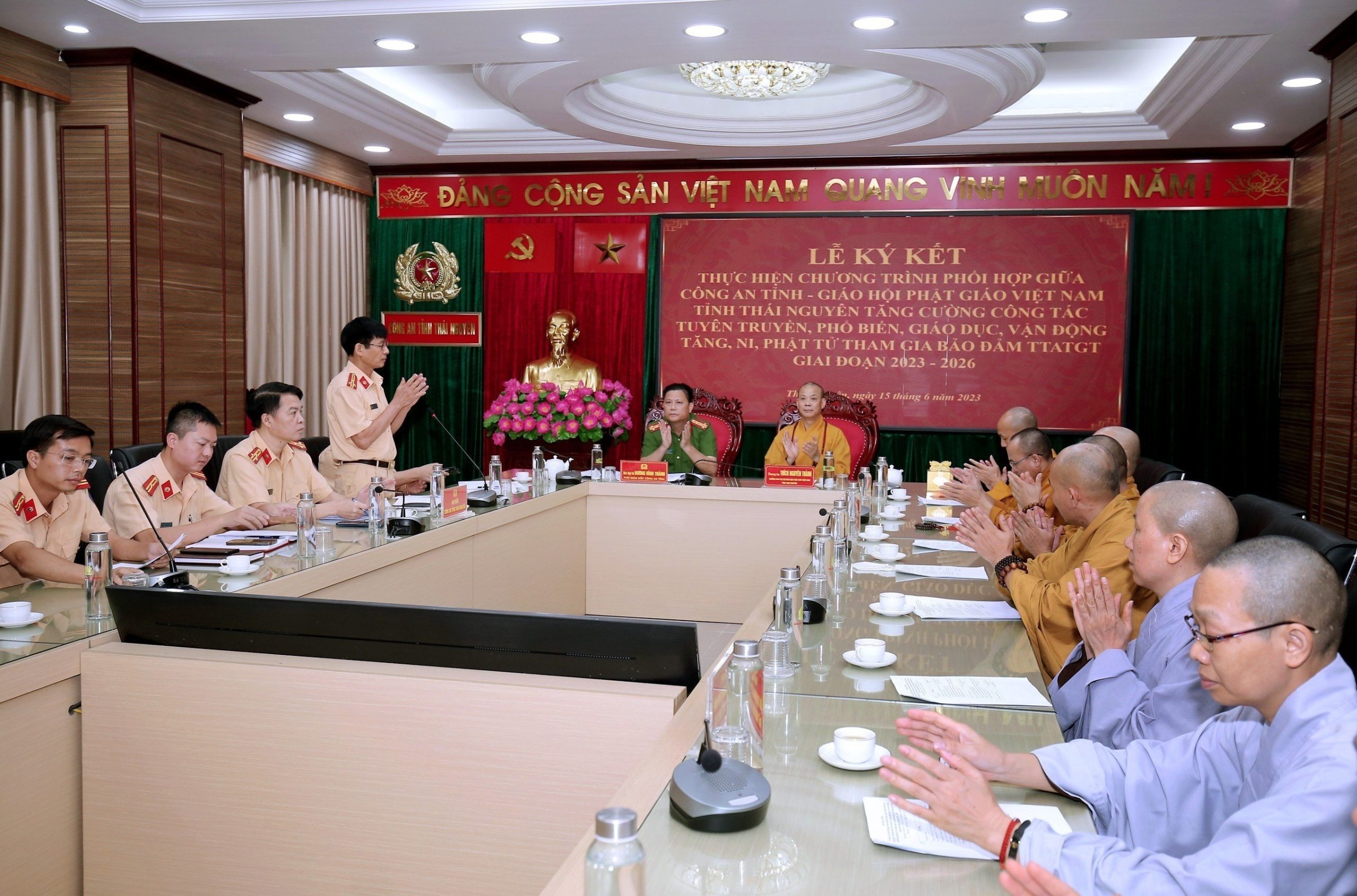 Tại buổi làm việc, Lãnh đạo Công an tỉnh cho rằng, tư tưởng chủ đạo của đạo Phật là dạy con người hướng thiện, xây dựng cuộc sống tốt đẹp, yên vui; với mong muốn sự ủng hộ và tham gia của lãnh đạo Giáo hội Phật giáo Việt Nam tỉnh Thái Nguyên hướng dẫn vận đông và tuyên truyền Tăng Ni, tín đồ Phật tử trong toàn tỉnh tham gia hưởng ứng phóng trào đảm bảo TTATGT giai đoạn 2023-2026