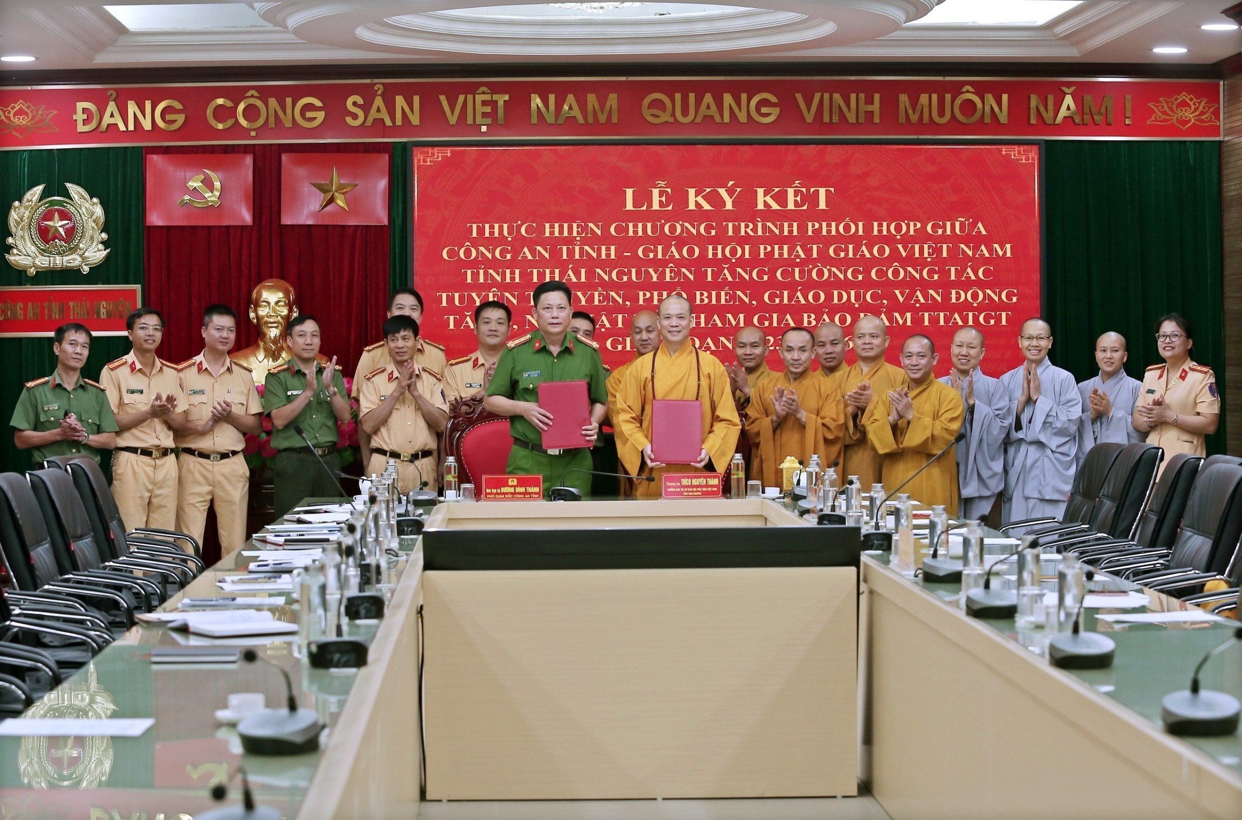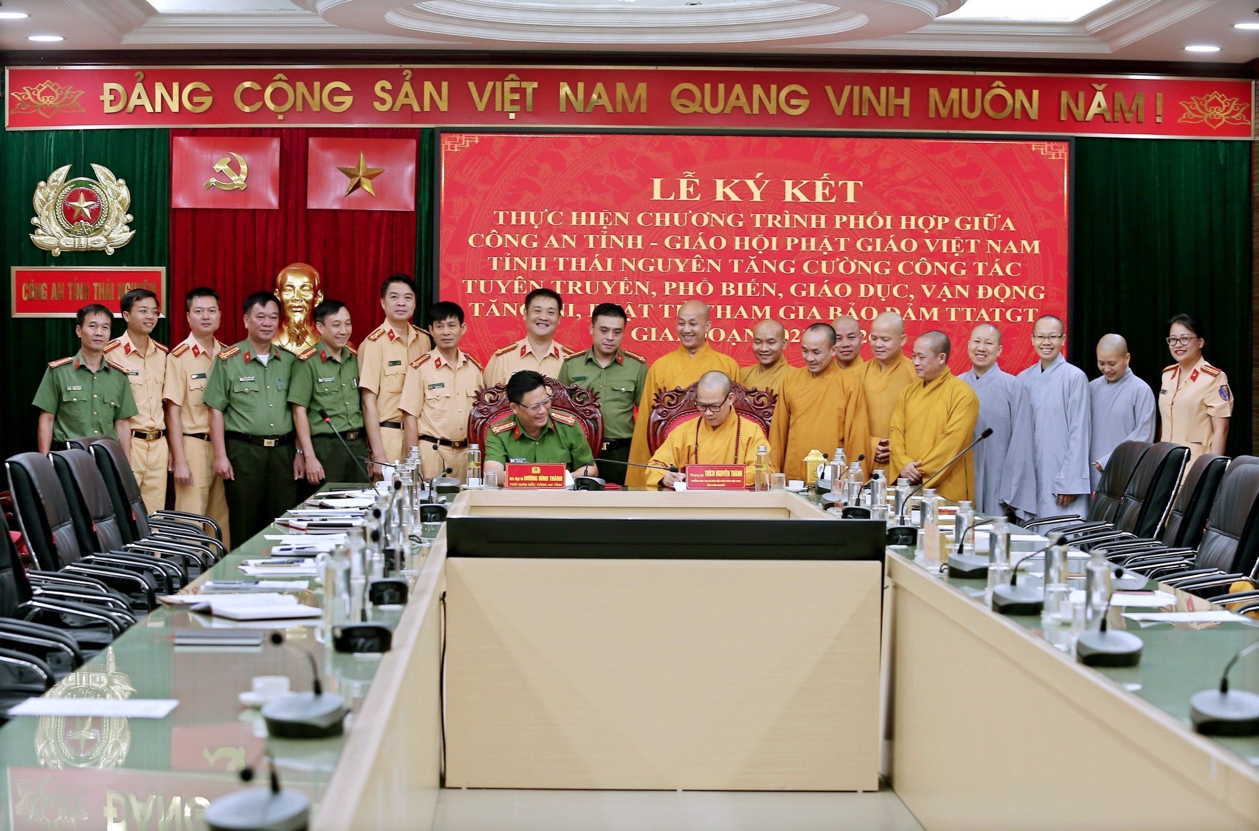 PSO - Thực hiện kế hoạch phối hợp giũa Cục Cảnh sát giao thông, Bộ Công an và Ban Thường trực Hội đồng trị sự, Trung ương GHPGVN về tăng cường công tác tuyên truyền, phổ biến, giáo dục, vận động Tăng Ni, Phật tử tham gia bảo đảm trật tự, an toàn giao thông giai đoạn 2023-2026. Chiều ngày 15/05, tại Trụ sở Công an tỉnh Thái Nguyên, Thường trực Ban Trị sự GHPGVN tỉnh đã có buổi làm việc và ký kết xây dựng kế hoạch phối hợp triển khai thực hiện chương trình “Đảm bảo trật tự, an toàn giao thông giai đoạn 2023-2026”.