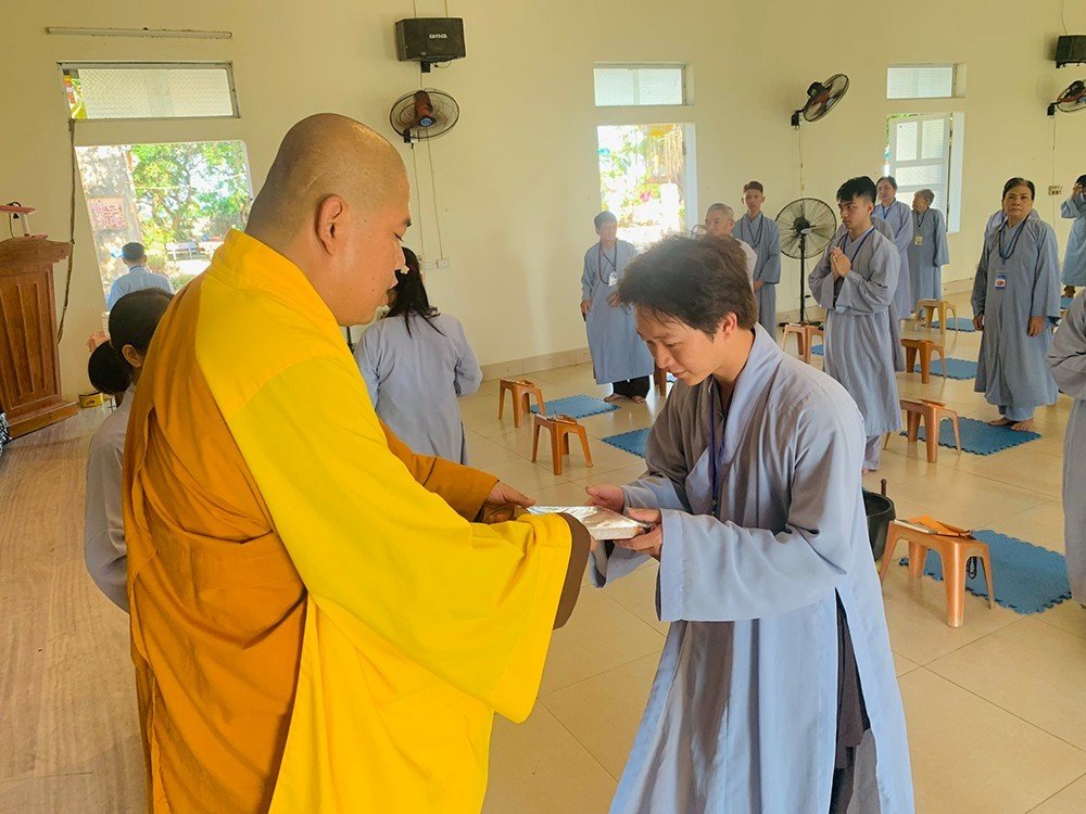 Kết thúc khóa tu là giây phút an lạc hiện hữu nơi khuôn mặt của mọi người tham dự và nhận phần quà pháp bảo “Hết lòng vì đạo” của hòa thượng Đạo trưởng Thích Chân Tính viết.