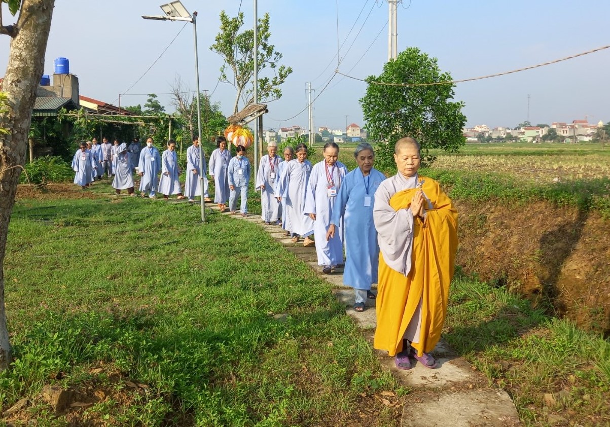 Mở đầu khóa tu, Sư thầy Thích Nữ Tịnh Nhu đã hướng dẫn đại chúng thiền hành bình minh nơi thôn quê.