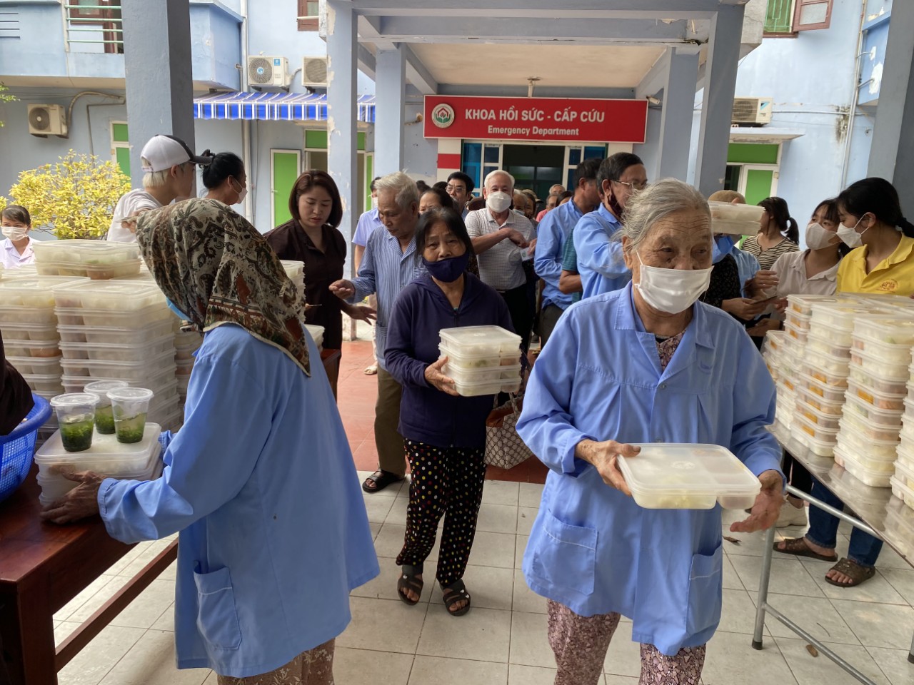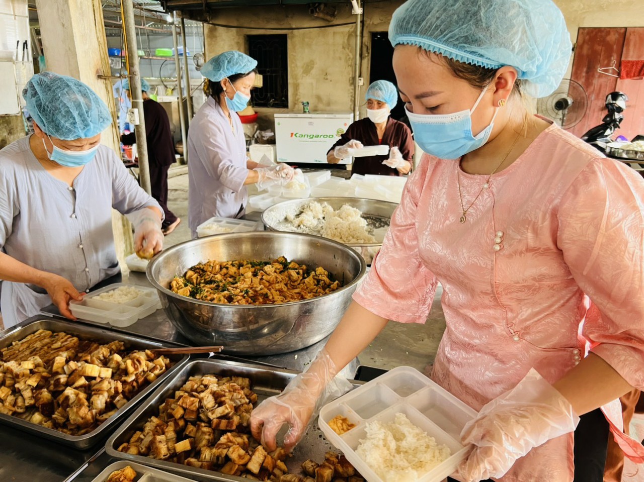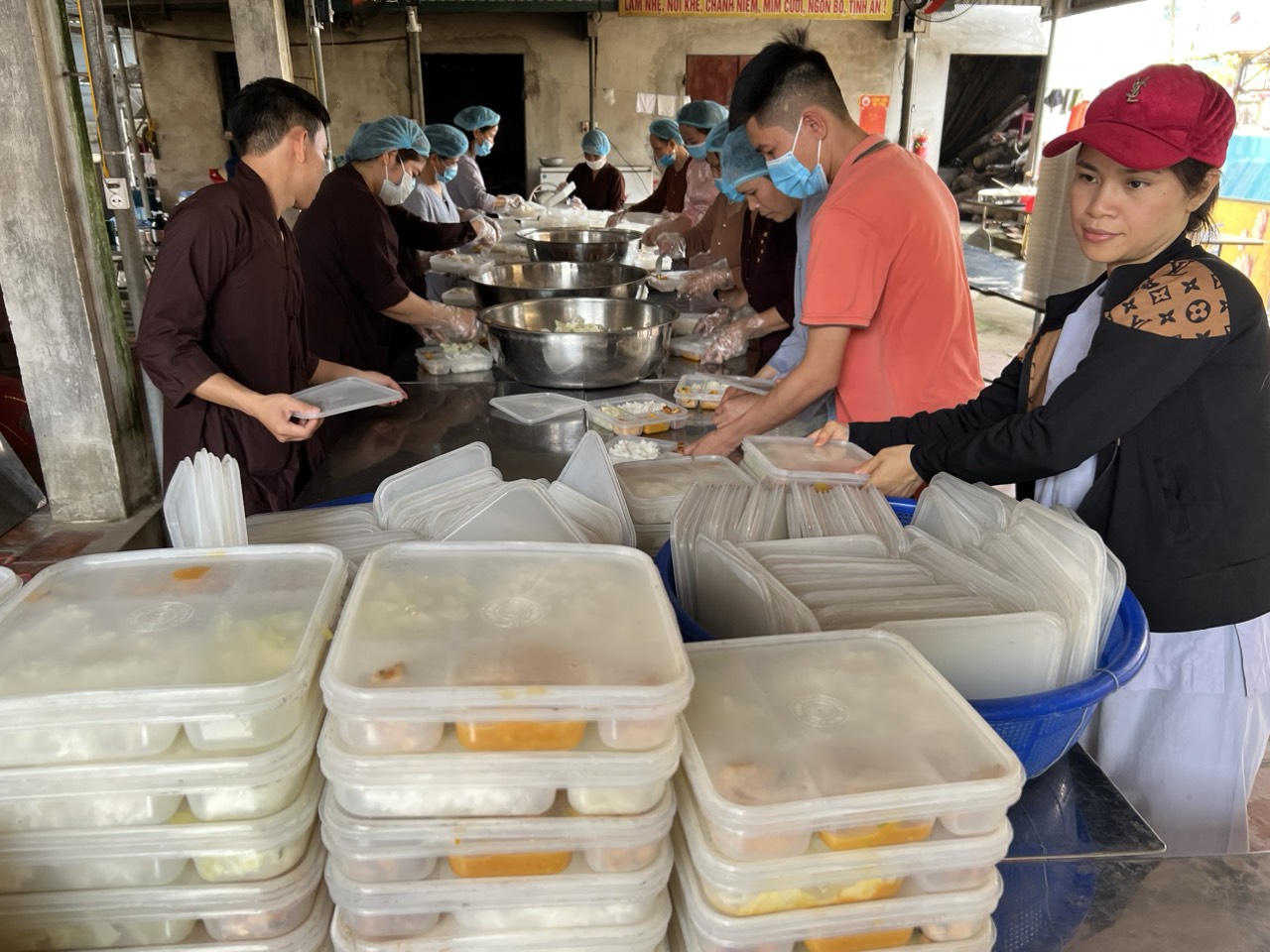 Cùng ngày, Đại đức trụ trì cùng Phật tử đã hỗ trợ gần 400 suất cơm chay trao tại Bệnh viện đa khoa Nga Sơn, do Phật tử Tịnh Đông phụ trách.