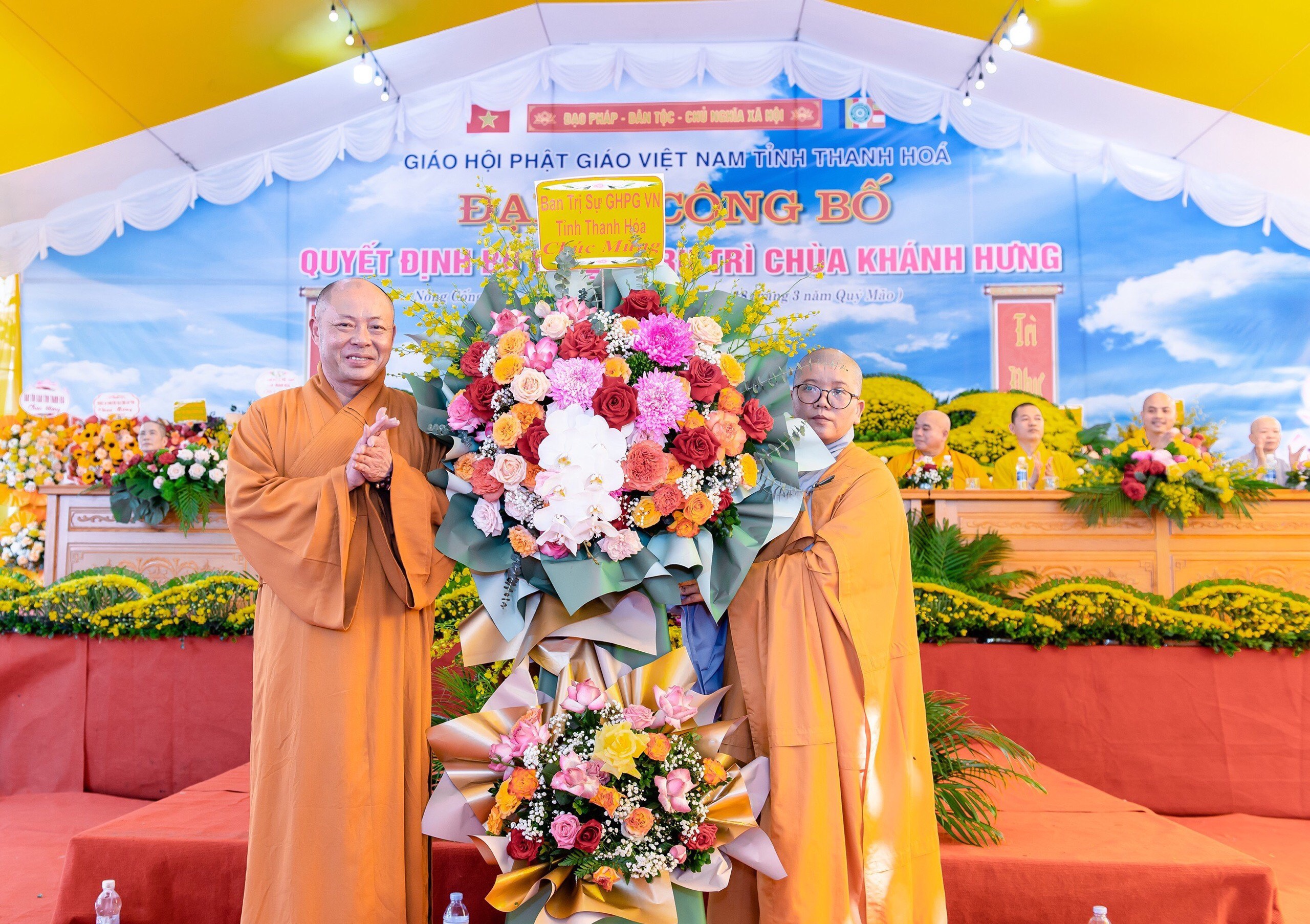 Dịp này, lãnh đạo Ban Trị sự GHPGVN tỉnh, các huyện và các ngành cùng chính quyền địa phương tặng nhiều phần quà, lẵng hoa chúc mừng Sư cô tân trụ trì.