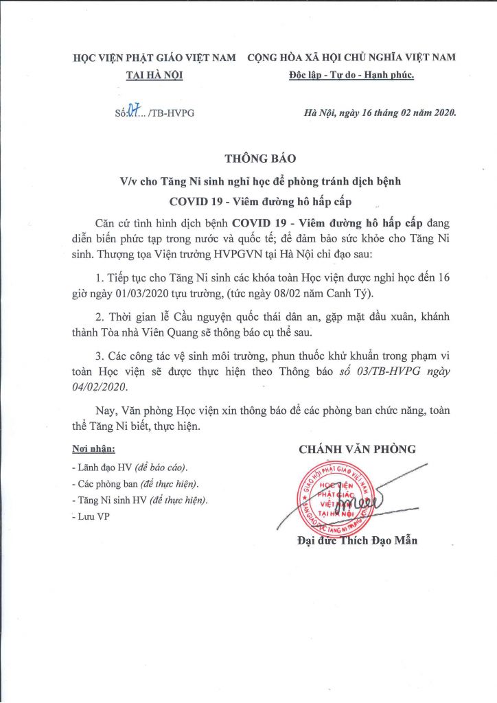 1. Tiếp tục cho Tăng Ni sinh các khóa toàn Học viện được nghỉ học đến 16 giờ ngày 01/03/2020 tựu trường (tức ngày 08/02 năm Canh Tý).