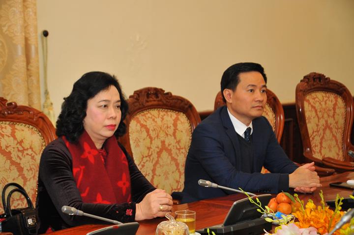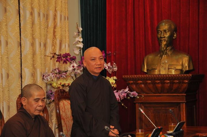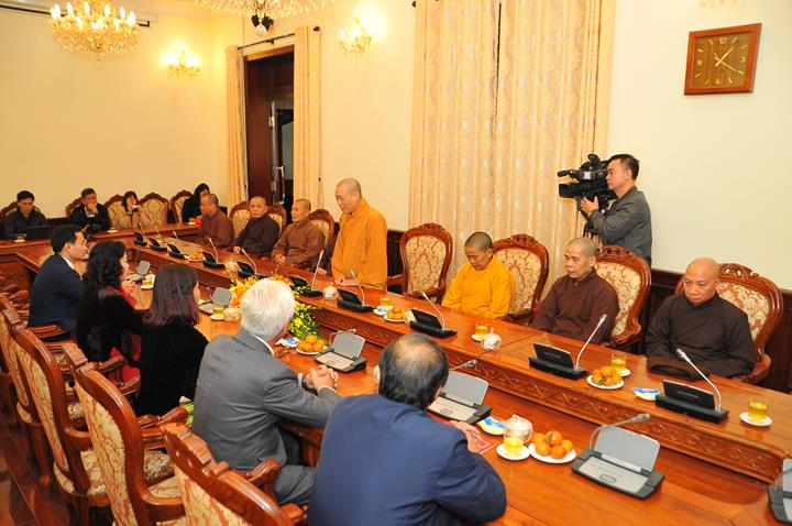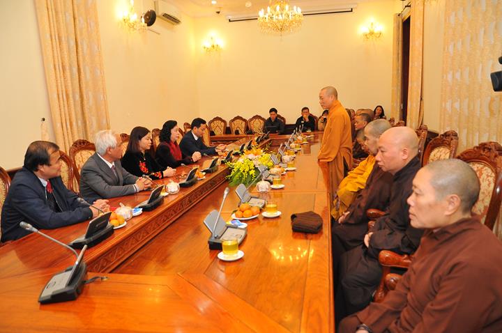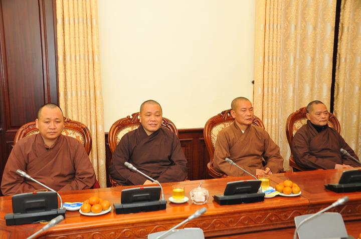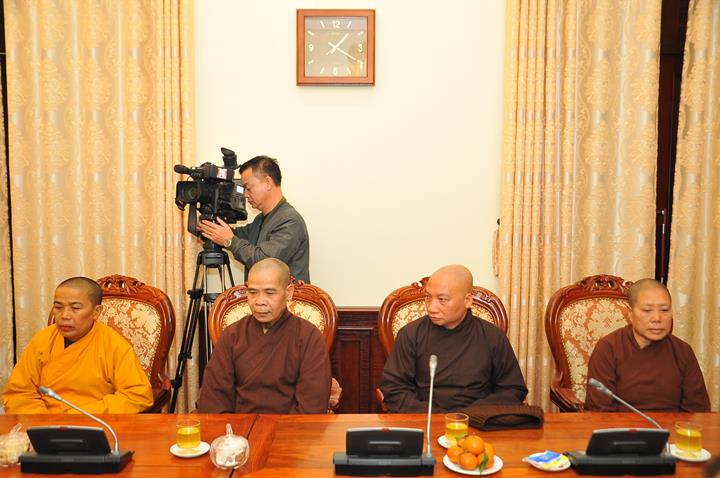 Cùng đi trong đoàn có: HT. Thích Thanh Chính - Ủy viên thường trực HĐTS, Phó trưởng ban thường trực BTS GHPGVN TP. Hà Nội; TT. Thích Minh Tuấn - Ủy viên HĐTS, Phó trưởng BTS GHPGVN TP. Hà Nội; TT. Thích Chiếu Tuệ - Ủy viên HĐTS, Phó Thư ký kiêm Trưởng ban Hoằng pháp GHPGVN TP. Hà Nội; TT. Thích Minh Trí - Ủy viên thường trực kiêm Trưởng ban Thông tin truyền thông GHPGVN TP. Hà Nội; ĐĐ. Thích Đạo Phong – Ủy viên HĐTS, Chánh Thư ký BTS GHPGVN TP. Hà Nội; Thượng toạ Thích Tâm Hoan - Ủy viên HĐTS, Phó thư ký kiêm Chánh văn phòng BTS GHPGVN TP. Hà Nội; ĐĐ. Thích Minh Đồng – Uỷ viên Ban thường trực, Phó Thư ký kiêm Phó văn phòng BTS GHPGVN TP. Hà Nội; Ni Sư Thích Đàm Bình - Ủy viên ban thường trực kiêm Phó phân ban Ni giới BTS GHPGVN TP Hà Nội. Đón tiếp phái đoàn có: bà Ngô Thị Thanh Hằng - Ủy viên Trung ương Đảng, Phó Bí thư Thường trực Thành uỷ Hà Nội; bà Nguyễn Thị Tuyến - Ủy viên ban thường vụ thành ủy, Trưởng ban dân vận thành ủy TP. Hà Nội; ông Nguyễn Thế Toàn – Phó trưởng ban thường trực ban Nội chính thành ủy TP. Hà Nội; ông Nguyễn Anh Tuấn – Phó chánh văn phòng phụ trách văn phòng thành ủy TP. Hà Nội cùng các đồng chí đại diện lãnh đạo văn phòng thành ủy TP. Hà Nội. Trong không khí vui mừng, phấn khởi của những ngày đầu xuân năm mới và kỷ niệm 90 năm Ngày thành lập Đảng, Hòa thượng Thích Bảo Nghiêm gửi lời chúc mừng tốt đẹp đến các vị lãnh đạo Thành phố. Với tinh thần Phật giáo đồng hành cùng dân tộc, Hòa thượng Thích Bảo Nghiêm đã gửi lời cảm ơn chân thành tới sự quan tâm, hỗ trợ của Đảng, Nhà nước và TP Hà Nội đối với các hoạt động phật sự của Giáo hội Phật giáo Việt Nam TP. Hà Nội nói riêng cũng như đối với Giáo hội Phật giáo Việt Nam nói chung, tạo điều kiện giúp đỡ cho GHPG Việt Nam tổ chức thành công nhiều sự kiện quan trọng. Đồng thời khẳng định, chính sự quan tâm, hỗ trợ đó đã giúp Phật giáo phát triển, hoạt động hiệu quả và góp phần vào sự phát triển chung của Thủ đô, đất nước. Thay mặt Ban Trị sự Giáo hội Phật giáo Việt Nam TP Hà Nội, Hòa thượng Thích Bảo Nghiêm một lần nữa chúc Đảng bộ, chính quyền và Nhân dân Thủ đô dồi dào sức khỏe và đạt được nhiều thành công to lớn hơn trong năm 2020. Đặc biệt là tổ chức thành công đại hội đảng bộ các cấp. Bày tỏ vui mừng đón tiếp đoàn Ban Trị sự Giáo hội Phật giáo Việt Nam TP Hà Nội, Phó Bí thư Thường trực Thành ủy Ngô Thị Thanh Hằng trân trọng cảm ơn, đánh giá cao sự đóng góp, đồng hành của Giáo hội đối với Thủ đô, đất nước. Đặc biệt trong năm 2019, Phật giáo thủ đô cùng bà con Phật tử đã tích cực tham gia các phong trào, cuộc vận động của thành phố, góp phần quan trọng vào những kết quả chung của Thủ đô. Bà cũng đã gửi lời chúc sức khỏe, thân tâm thường an lạc đến các vị chư Tôn đức Tăng Ni trong BTS GHPGVN TP.Hà Nội và mong muốn BTS Phật giáo Thủ đô sẽ tiếp tục đồng hành, đóng góp xây dựng đất nước và Thủ đô ngày càng phát triển.