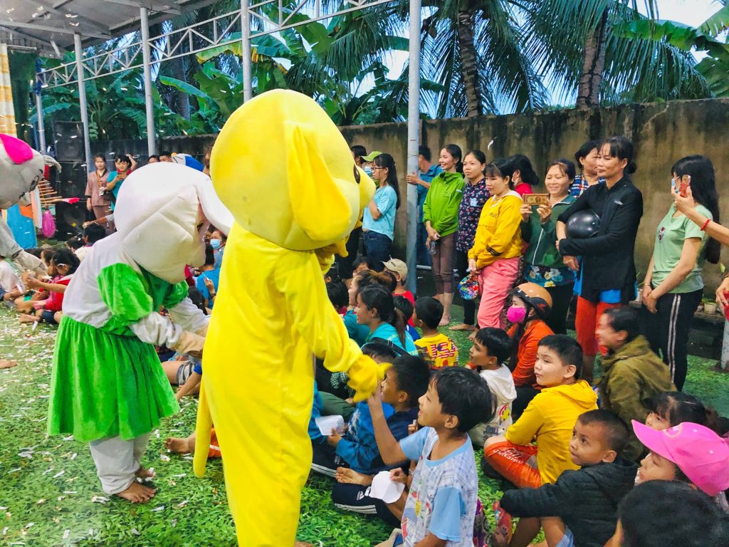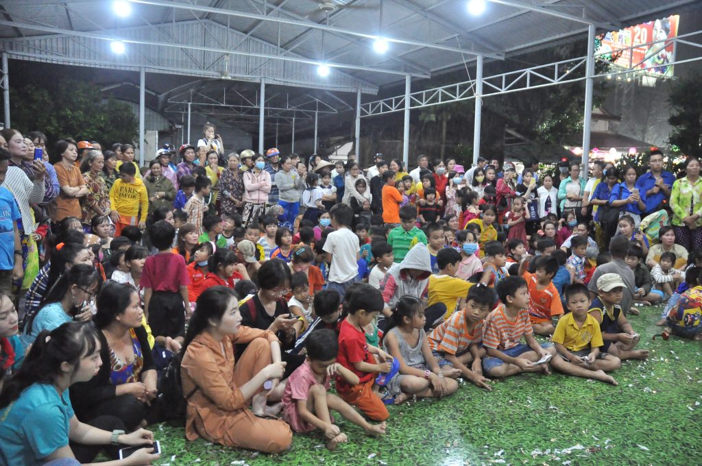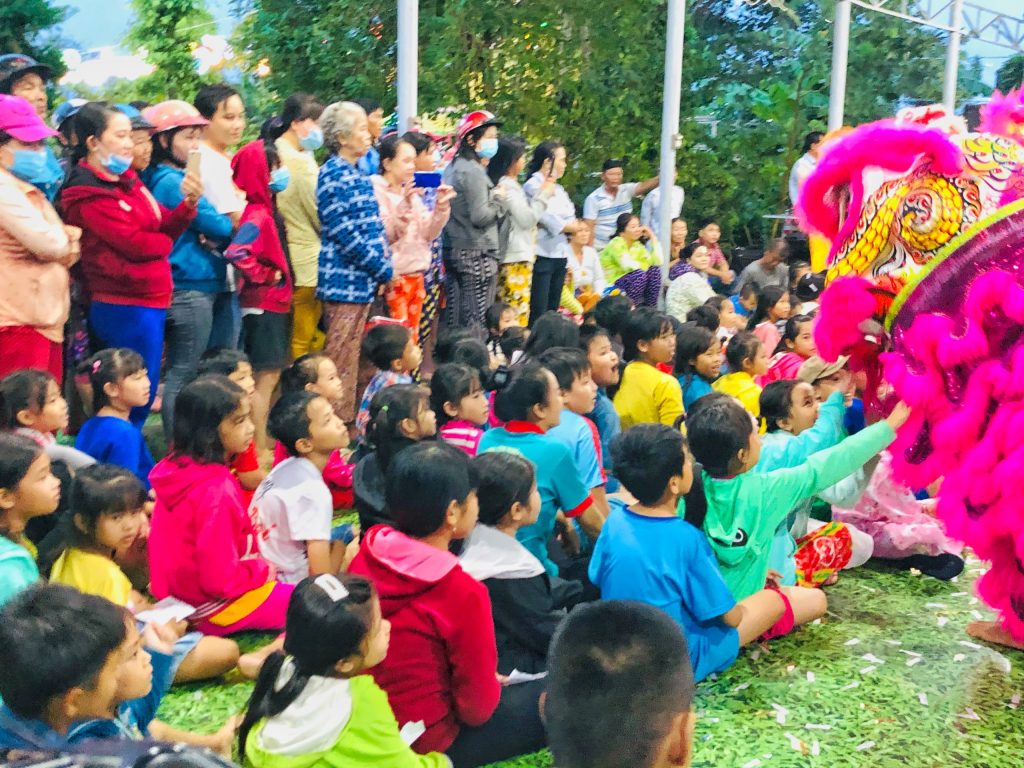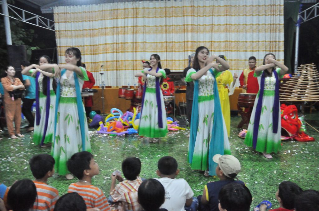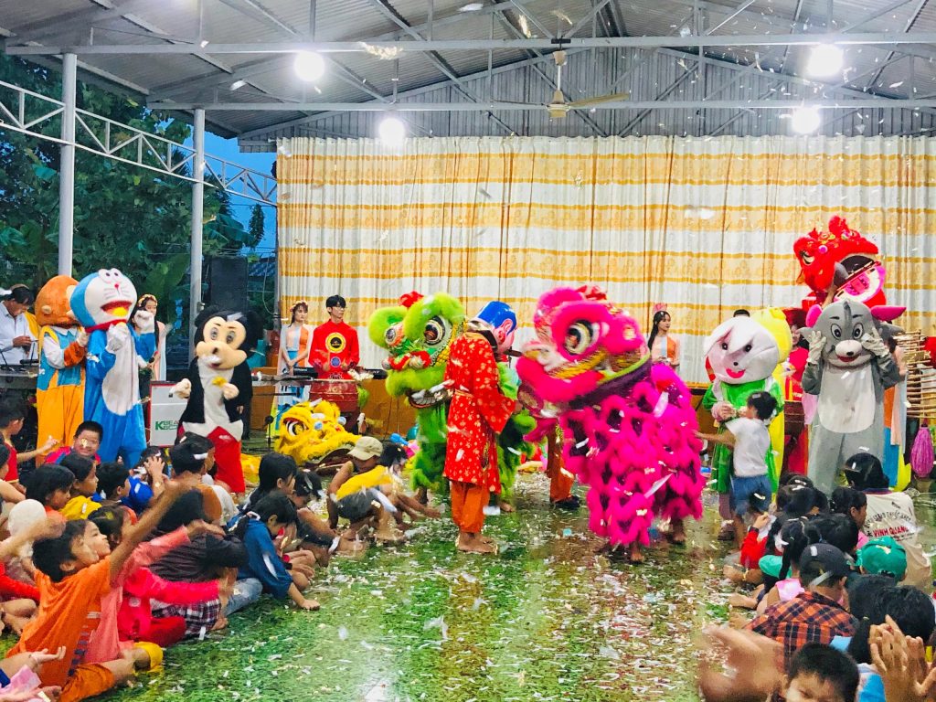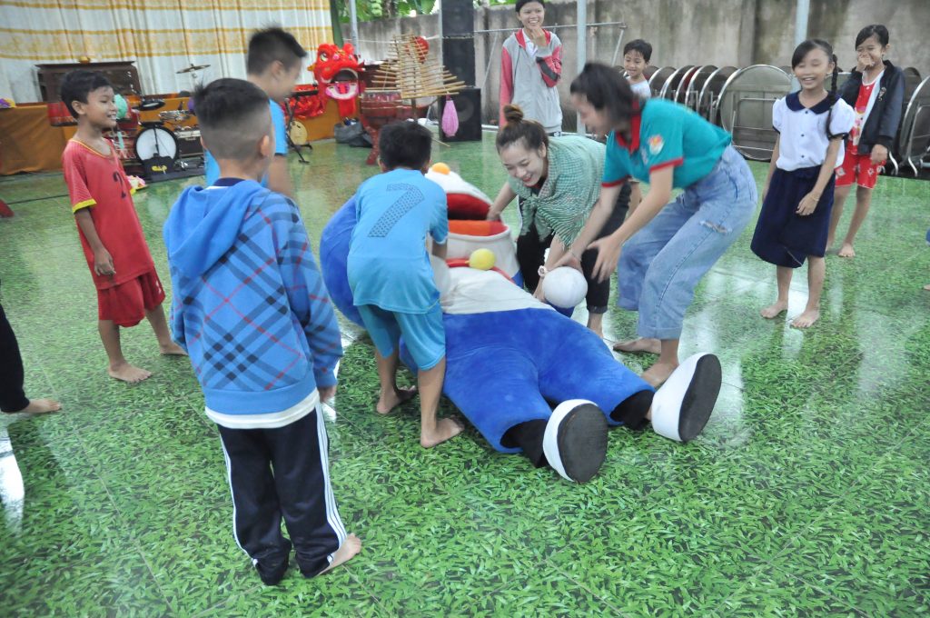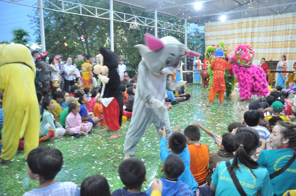 Tiếp theo, các em nhỏ được nhận quà bánh từ ban tổ chức, được vui chơi với chị Hằng và chú Cuội, đố vui nhận quà, nô đùa với các chú thú nhồi bông được các anh chị hóa trang, nghe kể các truyện cổ tích của anh chị tình nguyện viên chùa Hoằng Pháp, nghe ca hát, chọc ghẹo cùng các con Lân và Ông Địa. Đặc biệt là được các anh chị trong Cty nhạc cụ Vân Anh giới thiệu về các nhạc cụ như Đàn T’rưng, đàn Đá … đều là những nhạc cụ đặc sắc trong kho tàng nhạc khí Tây Nguyên.