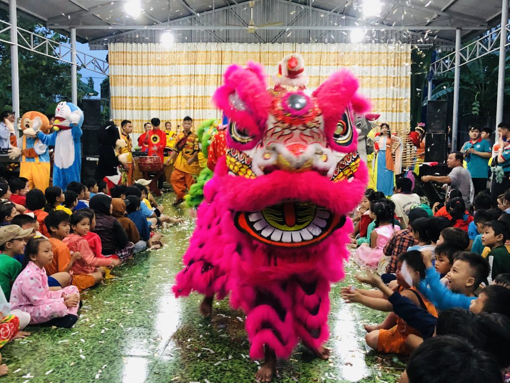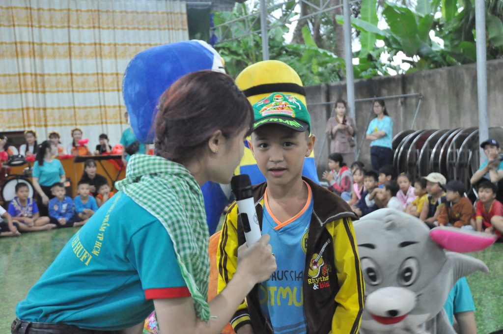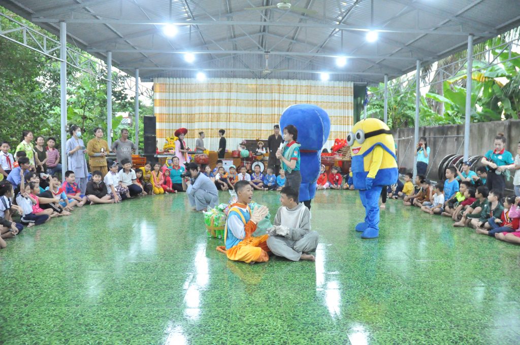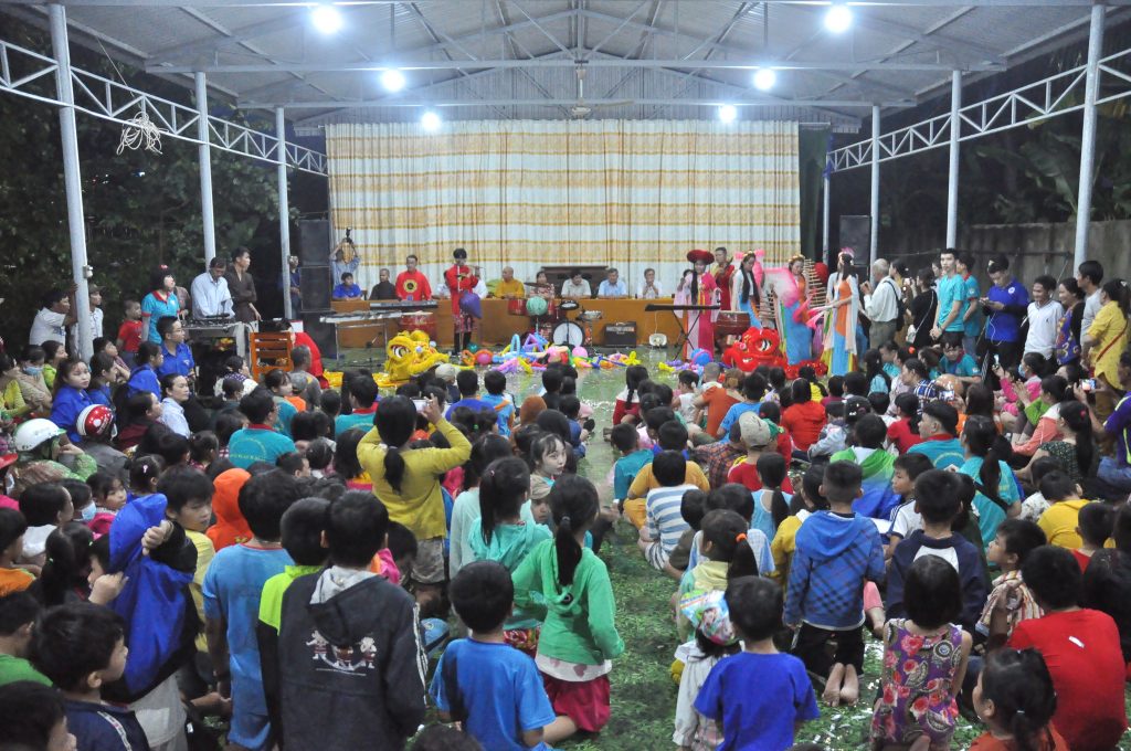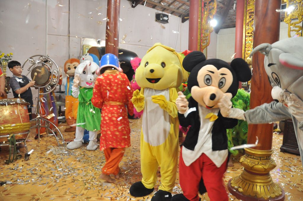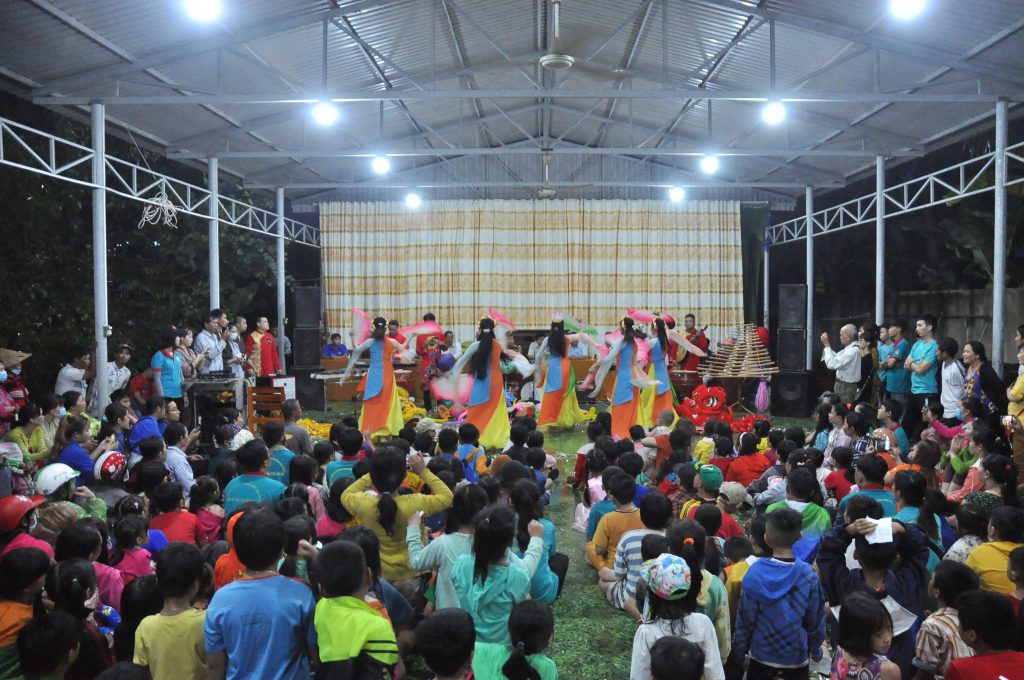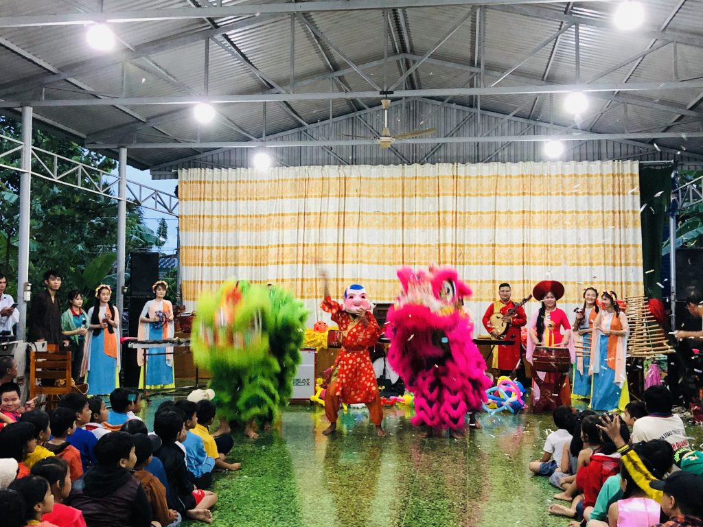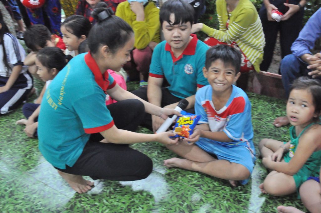Tiếp theo, các em nhỏ được nhận quà bánh từ ban tổ chức, được vui chơi với chị Hằng và chú Cuội, đố vui nhận quà, nô đùa với các chú thú nhồi bông được các anh chị hóa trang, nghe kể các truyện cổ tích của anh chị tình nguyện viên chùa Hoằng Pháp, nghe ca hát, chọc ghẹo cùng các con Lân và Ông Địa. Đặc biệt là được các anh chị trong Cty nhạc cụ Vân Anh giới thiệu về các nhạc cụ như Đàn T’rưng, đàn Đá … đều là những nhạc cụ đặc sắc trong kho tàng nhạc khí Tây Nguyên.