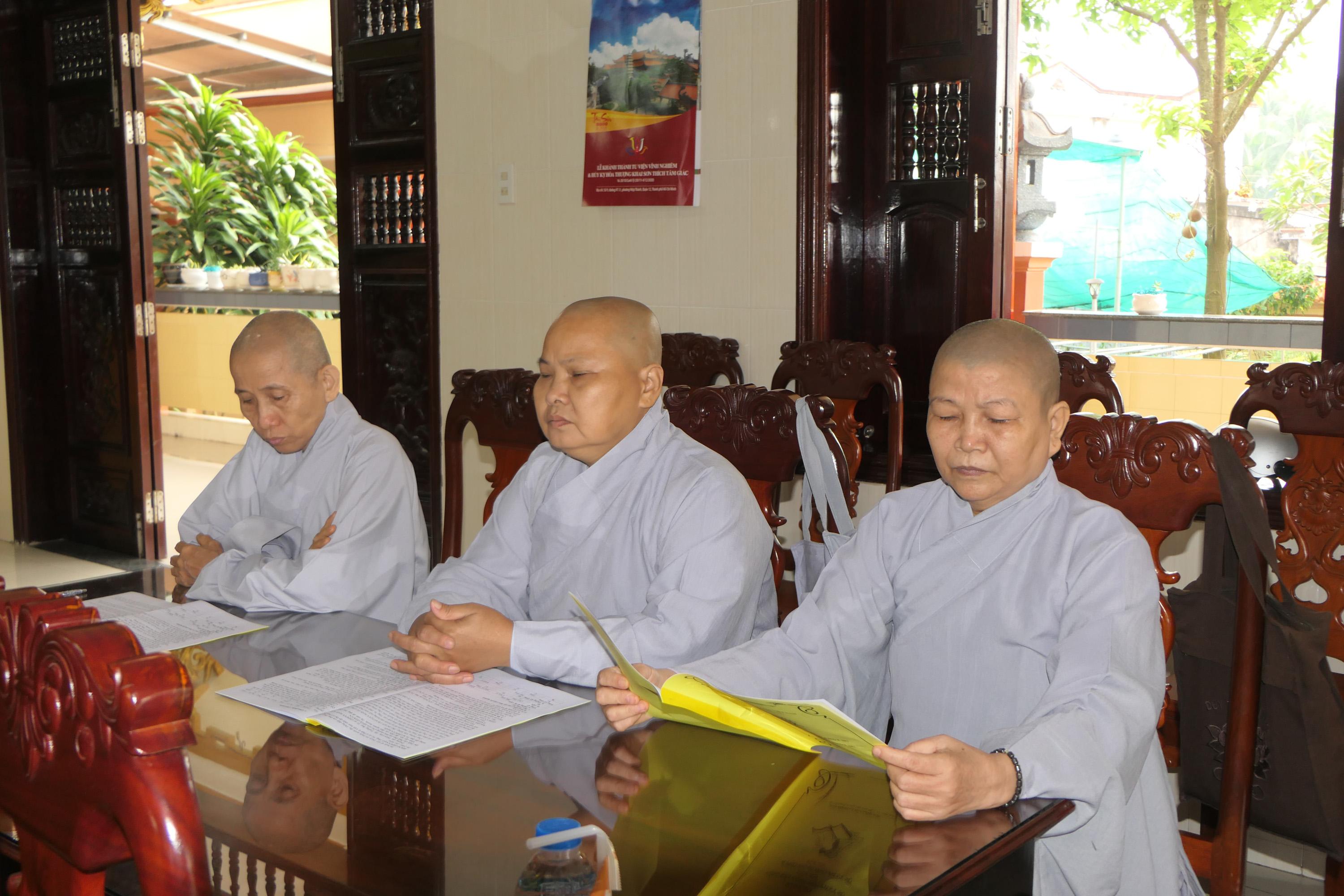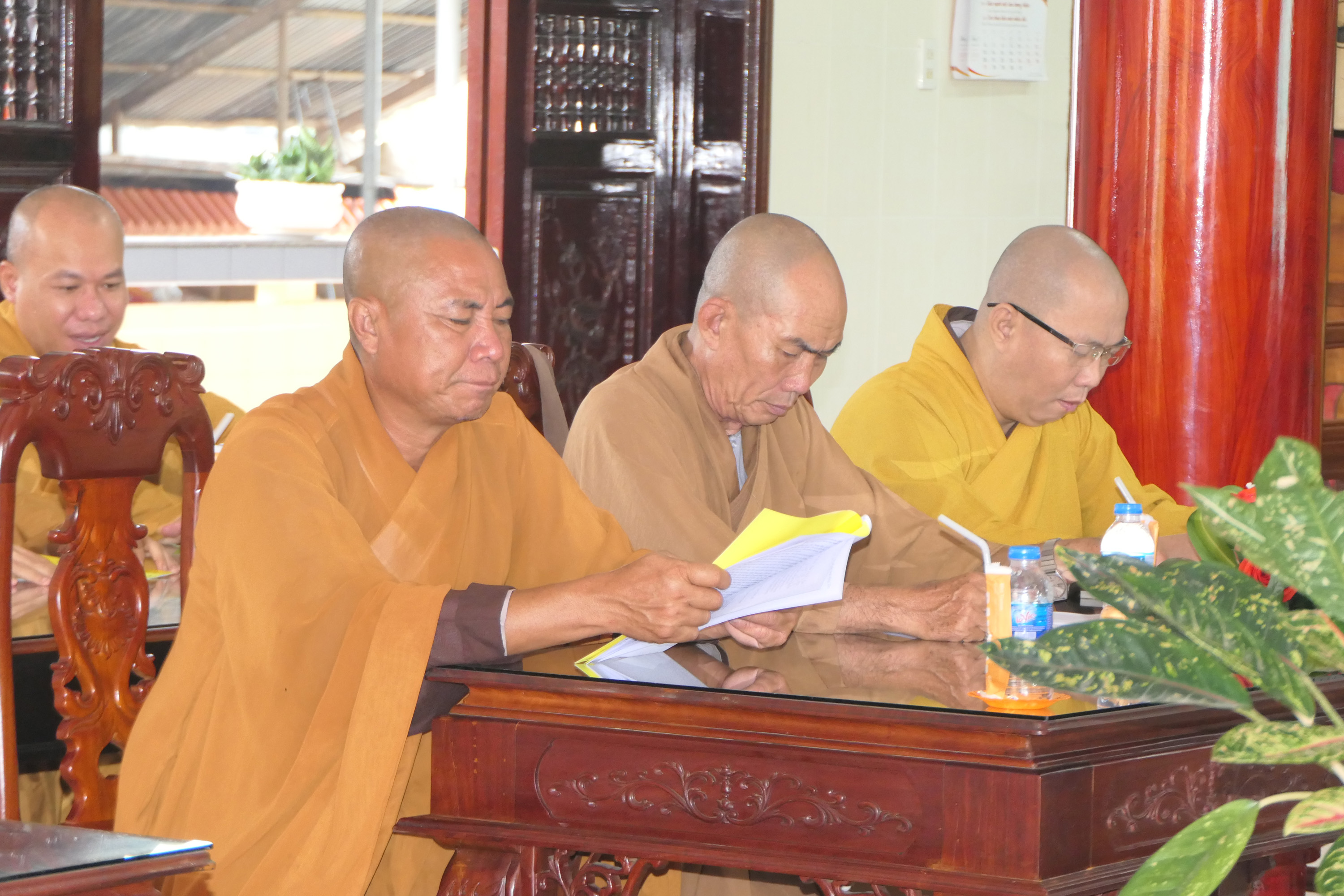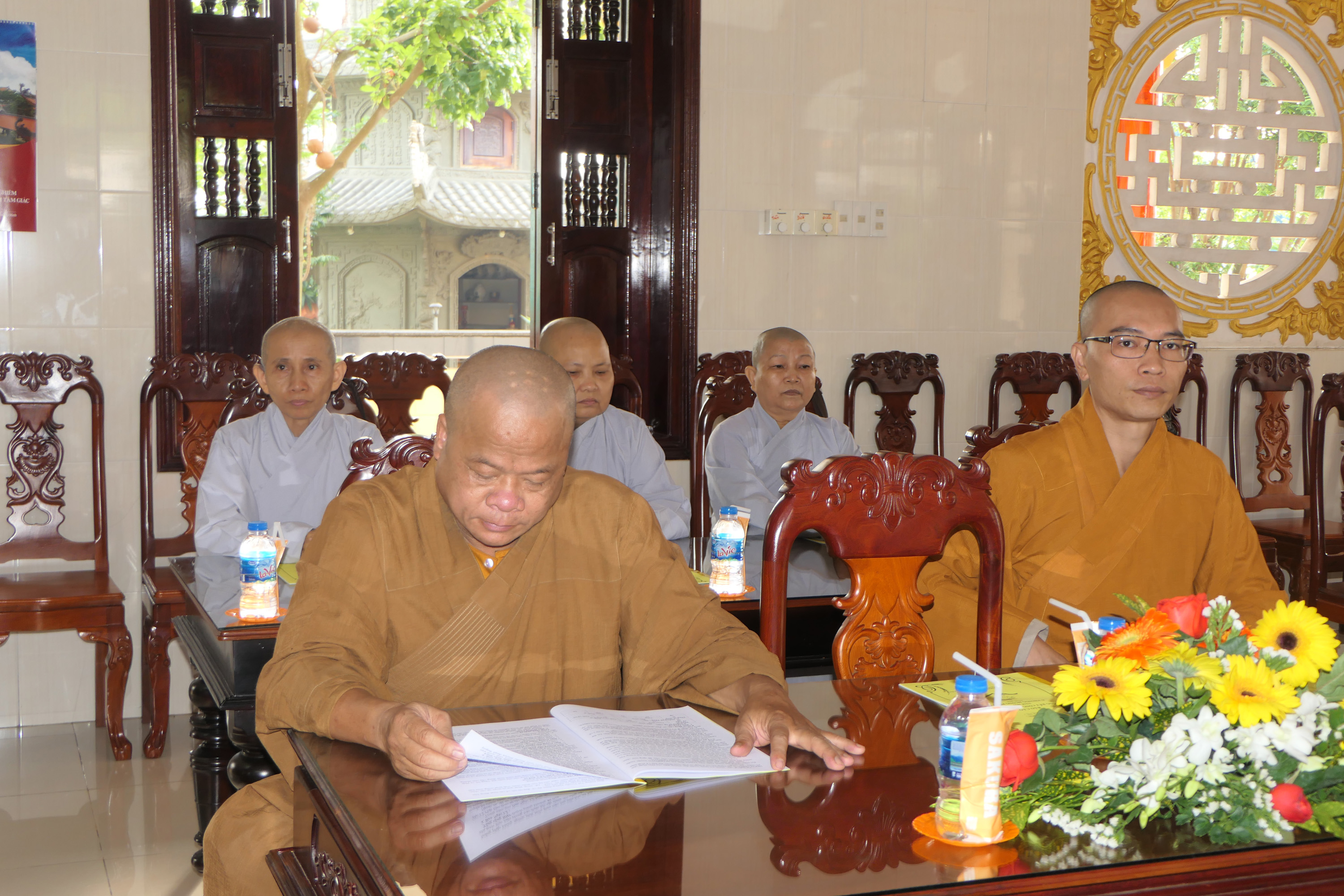 ĐĐ.Thích Trung Phước thay mặt Ban Thư ký đọc quyết định trao Bằng Tuyên dương Công đức của Thường trực BTS tỉnh Tiền Giang và cung thỉnh HT.Thích Trí Huờn trao bằng Tuyên dương đến chư Tăng Ni đạt thành tích hoạt động Phật sự tốt trong năm qua.