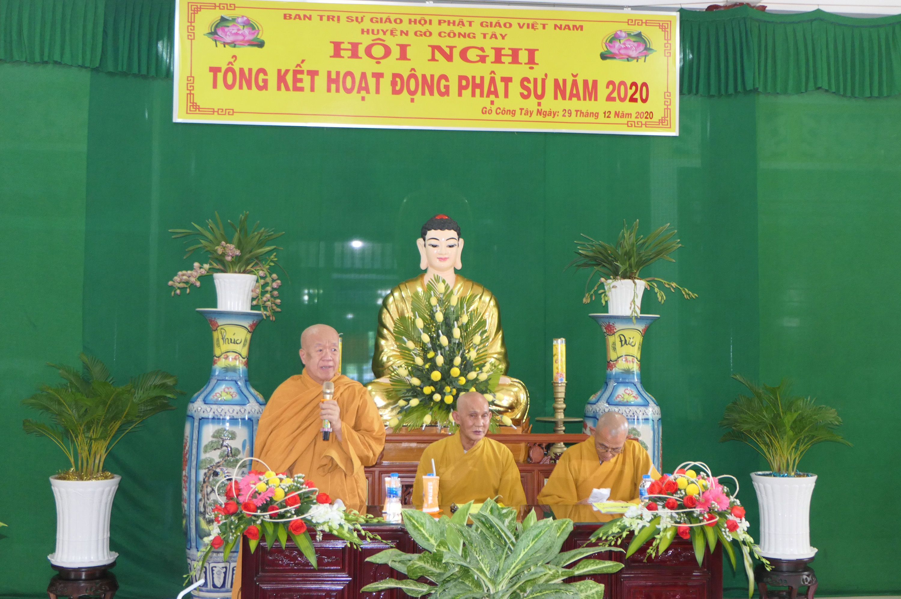 ĐĐ.Thích Trung Phước - Chánh Thư ký BTS GHPGVN huyện Gò Công Tây đọc báo cáo trước Hội nghịSau khi niệm Phật cầu gia hộ, ĐĐ.Thích Trung Phước– Chánh Thư ký BTS Phật giáo huyện đã báo cáo các công tác hoạt động Phật sự trong năm 2020. Theo đó, Phật giáo huyện Gò Công Tây có 30 ngôi tự viện, trong đó 28 ngôi chùa Bắc Tông (20 chùa Tăng, 08 chùa Ni) và 02 ngôi Tịnh xá. Số lượng Tăng, Ni trong huyện có 78 vị (Bắc tông 42 vị Tăng; 34 vị Ni; Khất sĩ 02 vị Tăng). Giáo phẩm Hoà thượng có 02 vị; 02 vị Thượng toạ; 01 Ni sư. Năm 2020 BTS đề cử tấn phong 02 vị Thượng tọa lên Hoà thượng và 02 vị Sư cô lên Ni sư, hồ sơ đã được chấp thuận.