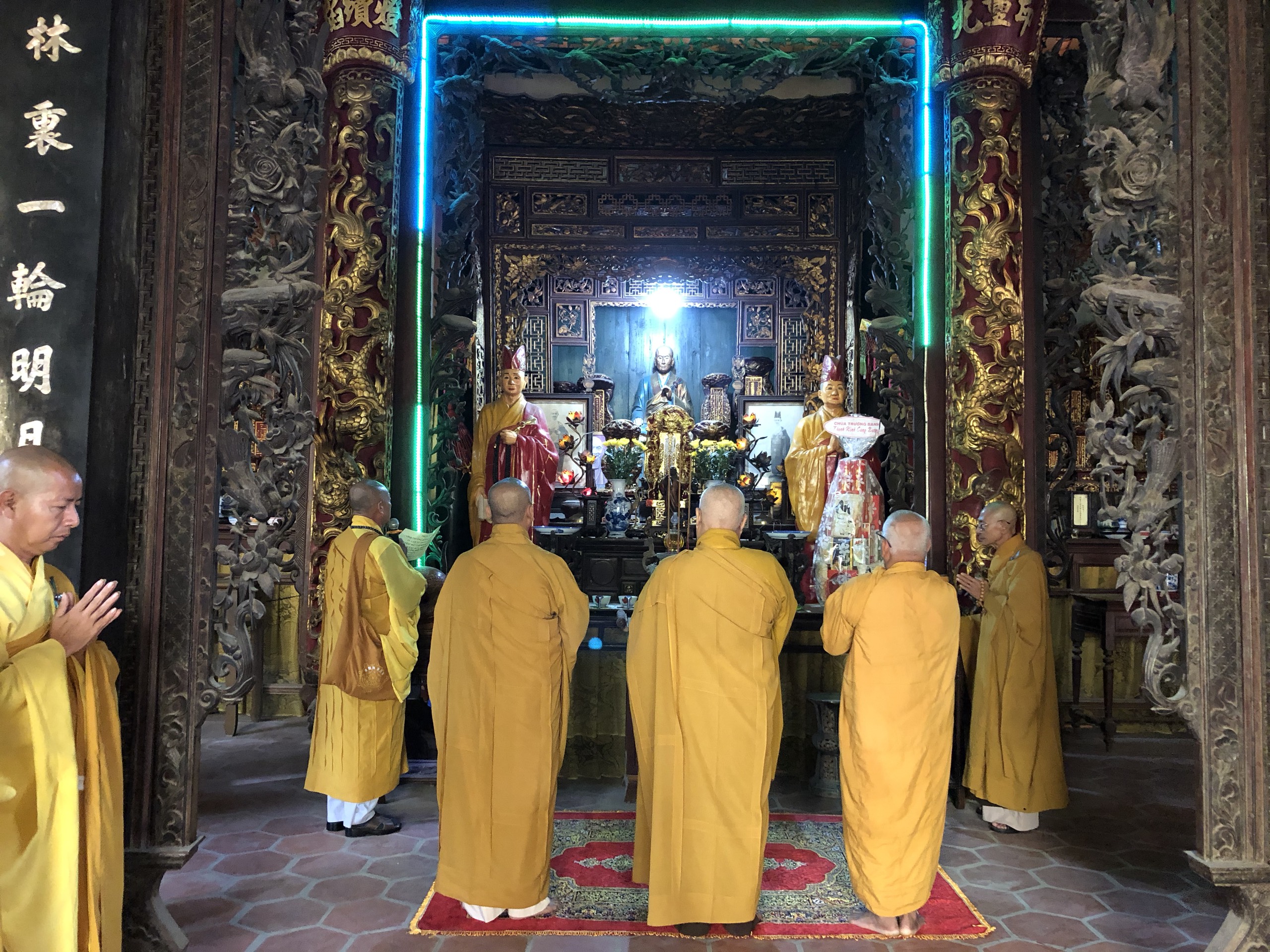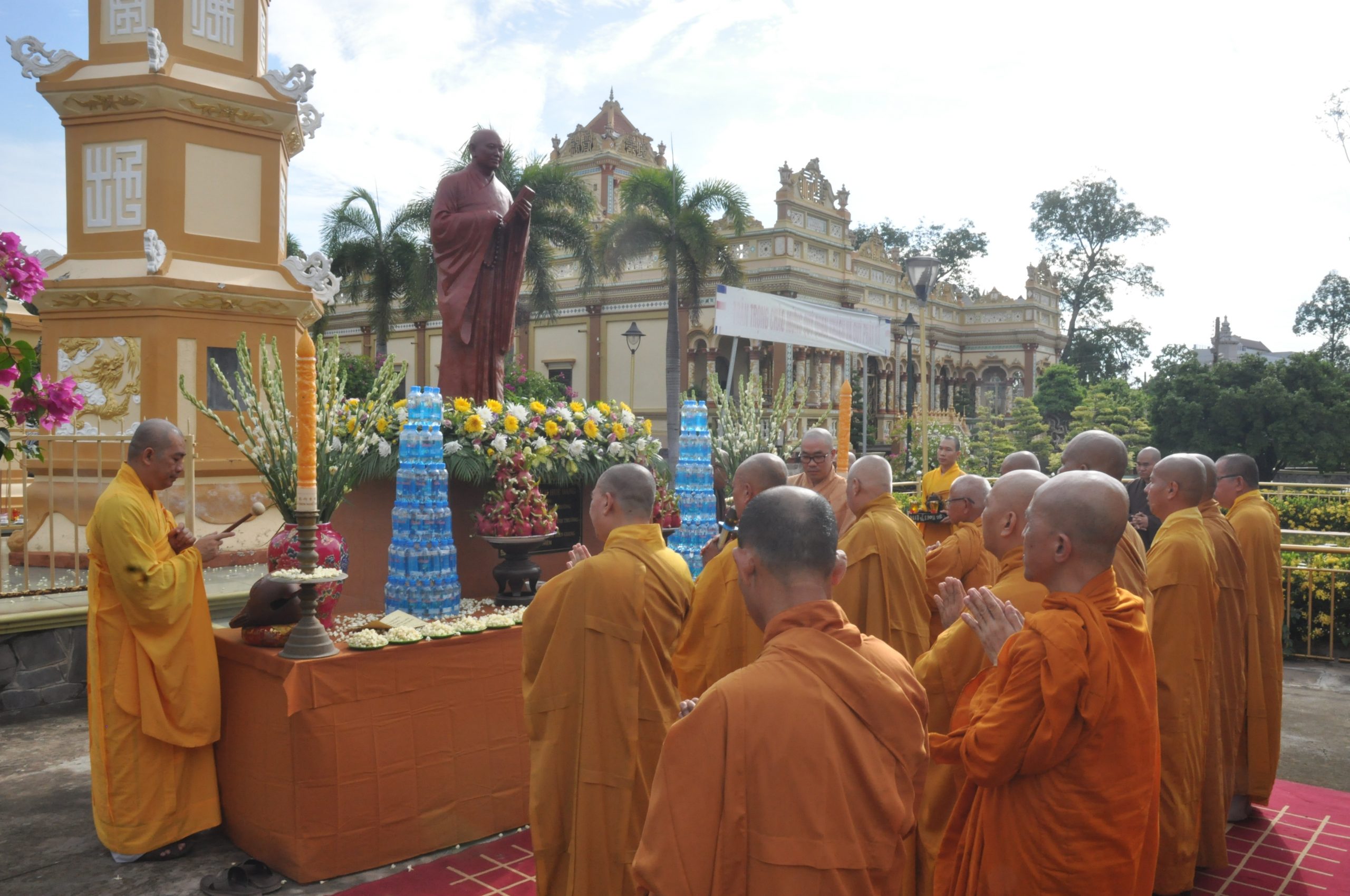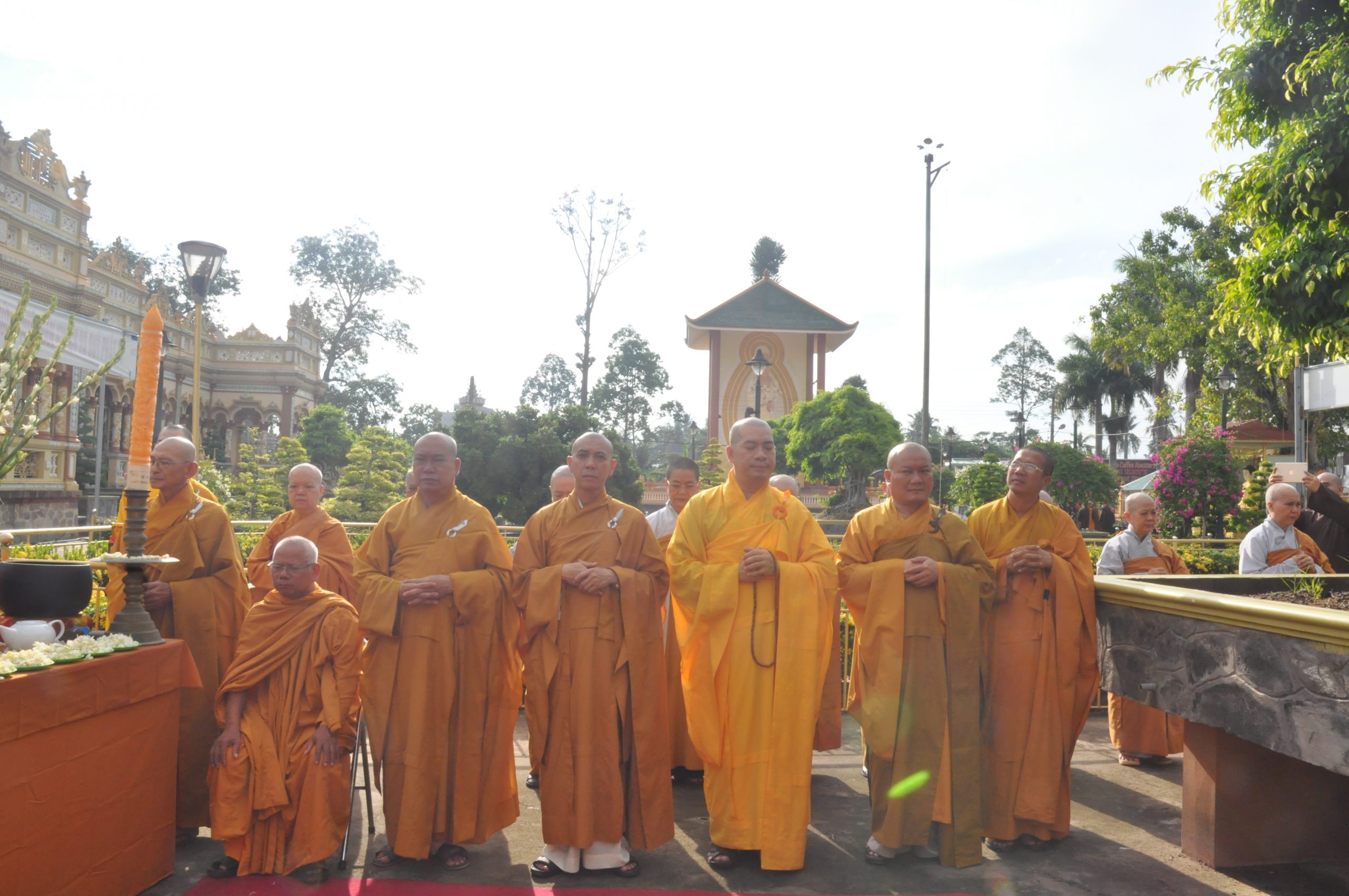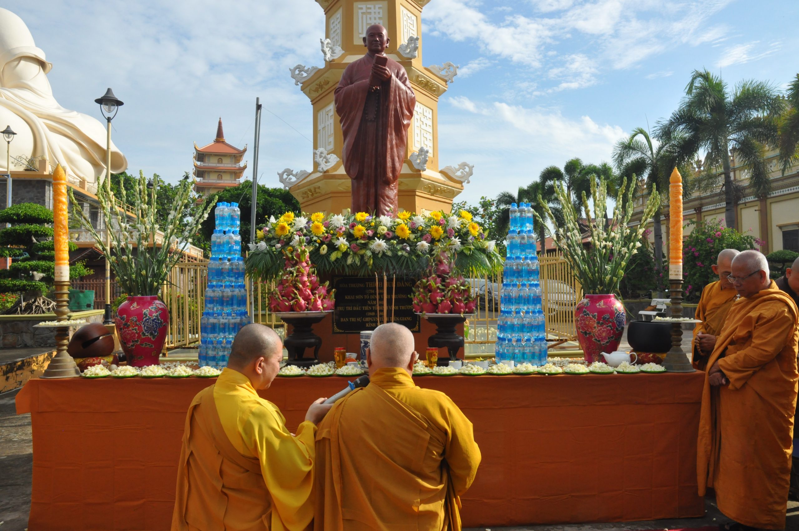Sáng nay, trước khi bước vào phiên họp lệ, chư Tôn đức trong BTS GHPGVN tỉnh Tiền Giang trang nghiêm cử hành nghi thức An vị Tôn tượng Tổ sư. Dưới án hương trầm quyện tỏa, HT.Thích Huệ Minh đã thay mặt Ban Tổ chức cung tuyên Tiểu sử Tổ sư Huệ Đăng – vị Khai sơn chùa Vĩnh Tràng; để rồi từ đó, trải qua bao thế hệ kế thừa và không ngừng vun bồi của chư Hòa thượng tiền bối, ngôi chùa Vĩnh Tràng ngày nay mang vẽ đẹp độc đáo và trở thành trung tâm của Phật giáo tỉnh Tiền Giang, cả về tâm linh lẫn hành chánh.